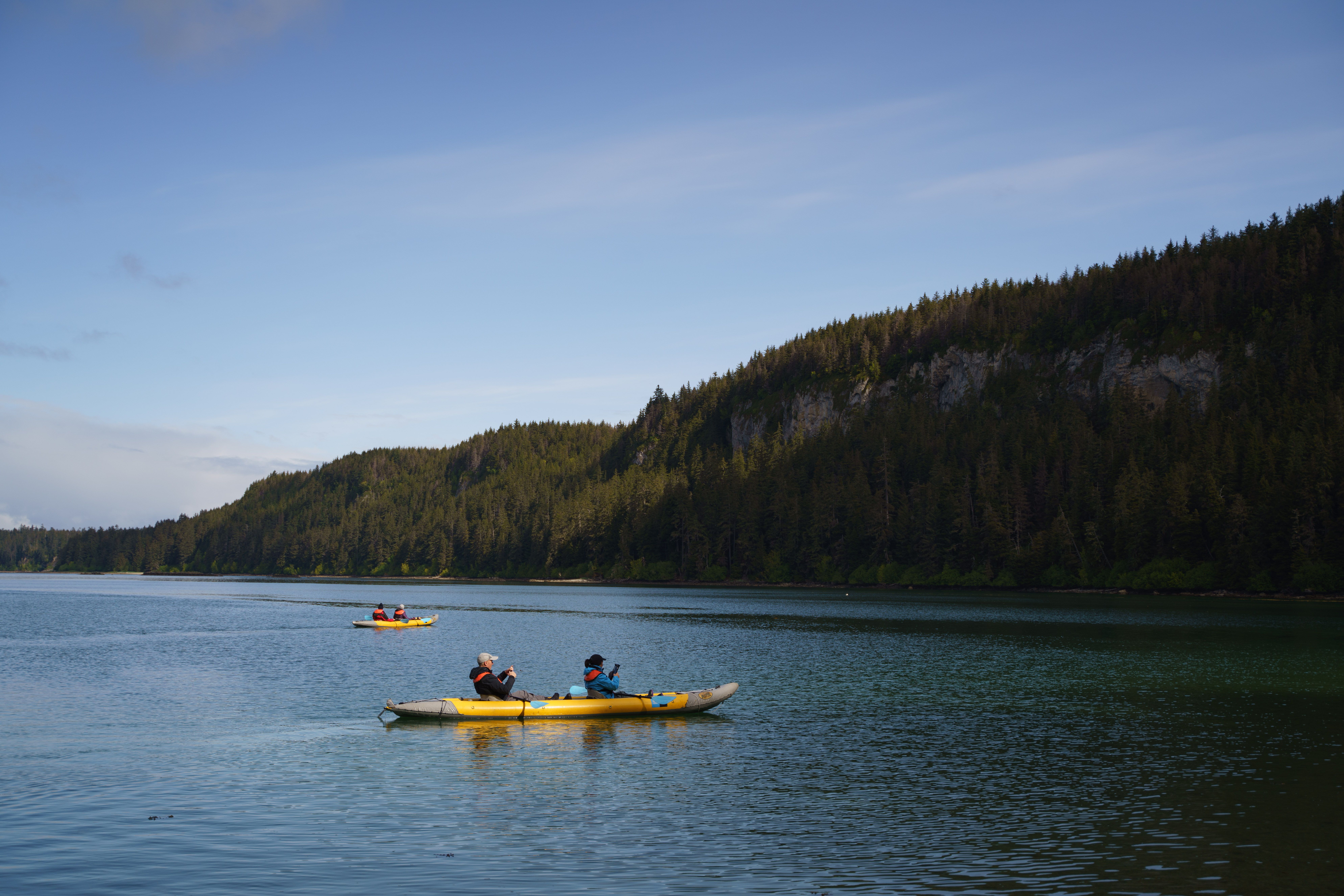 Today’s weather was just about as nice as we could have asked for here in Southeast Alaska. The morning was calm and moody, but as the day went on, the clouds burned off and left us with some blue skies and sunshine. Guests had the chance to kayak and hike inside the scenic bay of Hallack Harbor on Kuiu Island. We then lifted the anchor and headed up Chatham Strait, finding a few humpback whales diving and swimming in the late evening.