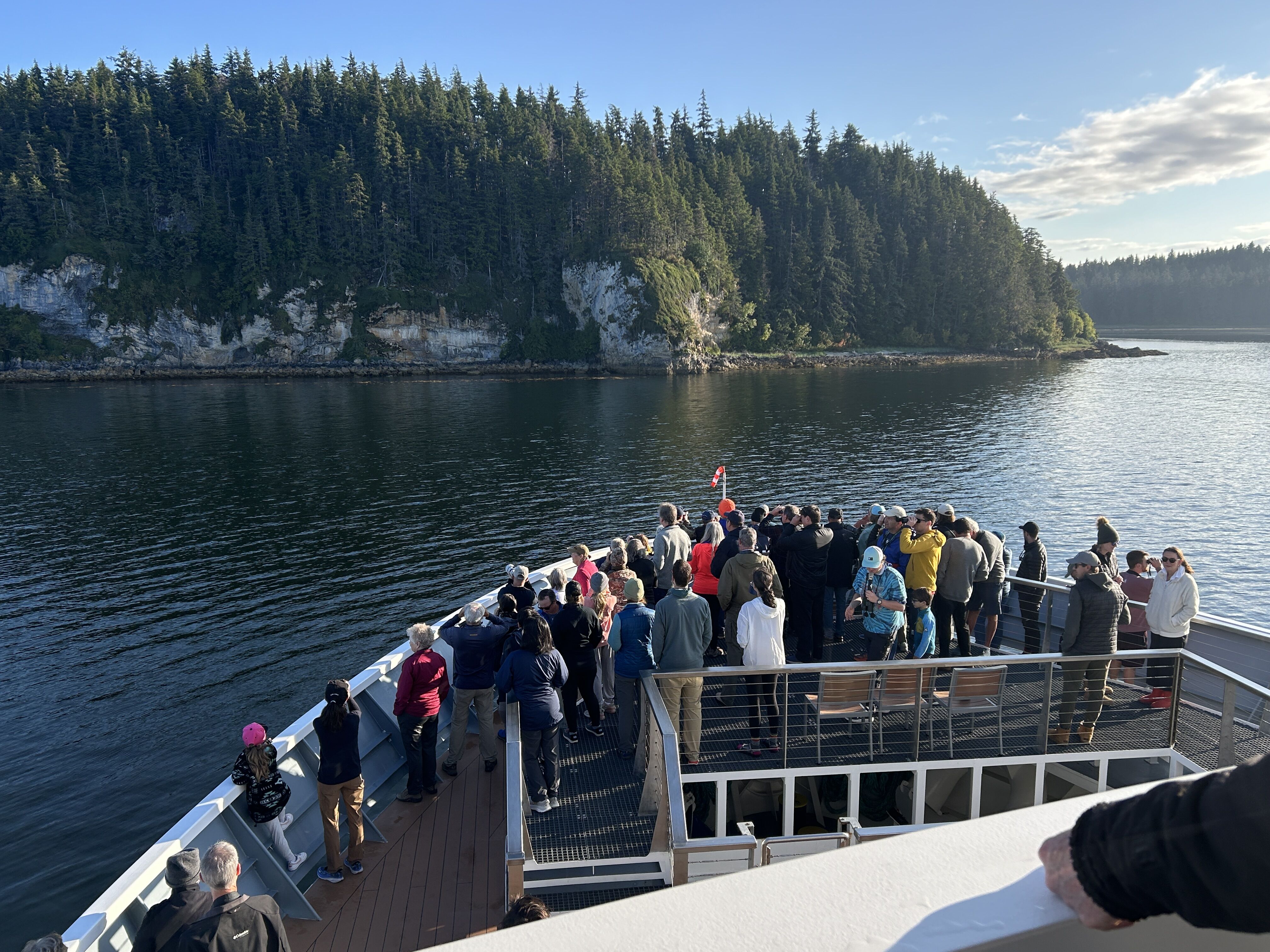 What a day full of adventure and wildlife! Our day began about 7:15 under sunny skies, as the captain skillfully maneuvered the bow of the ship close to a limestone wall for us to view a Tlingit pictograph of the sun. Little is known about the pictograph, but it is believed to be 300 years old.