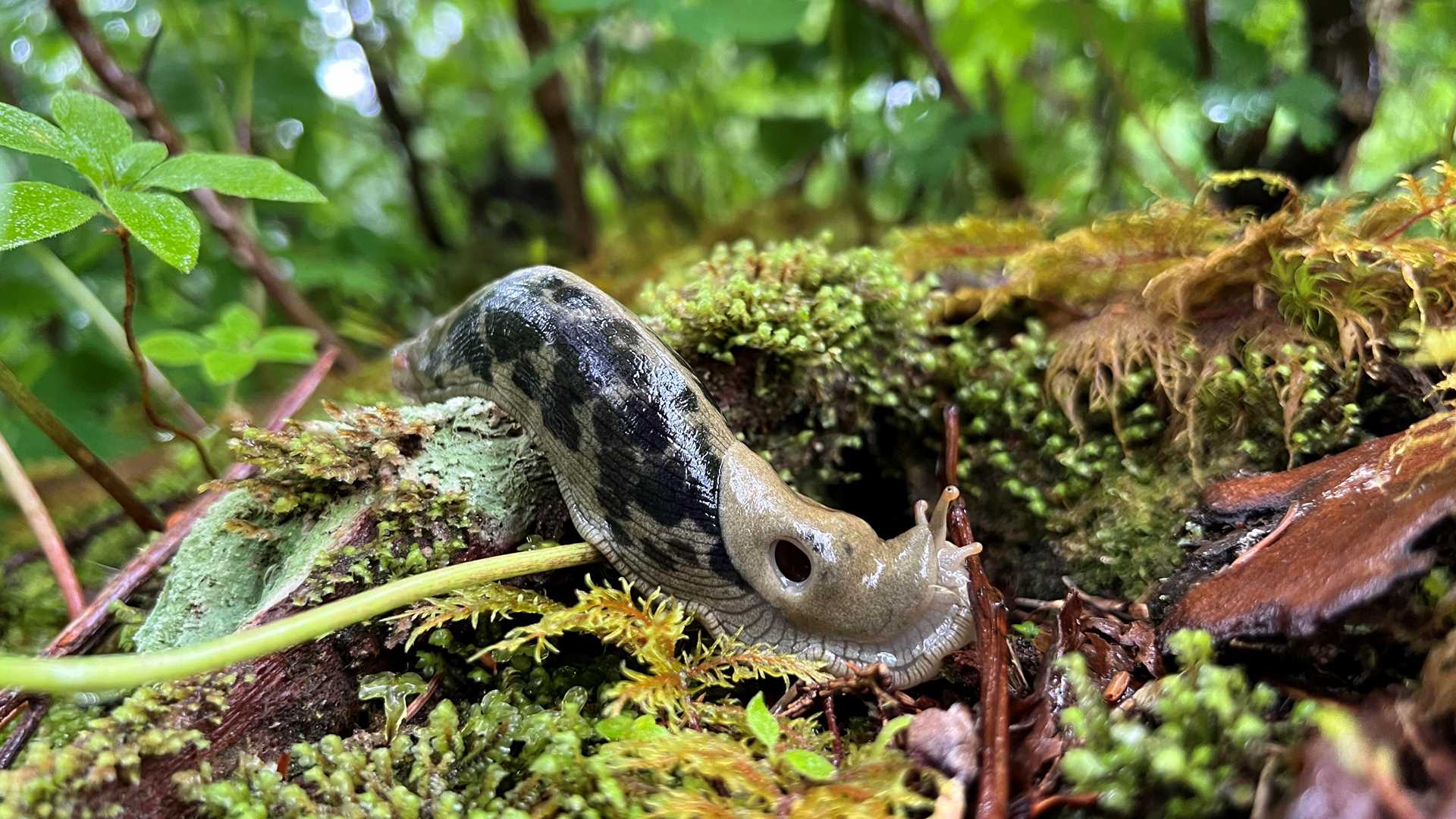 After breakfast, we dropped anchor in Hanus Bay to enjoy one last visit to this lush, green, moss-draped wilderness. Less than 100 yards up the trail, we found fresh bear scat containing plants that the local brown bears have been feeding on as they await the salmon. Huge banana slugs, the most charismatic of slugs, grazed upon the wet vegetation of the forest floor.