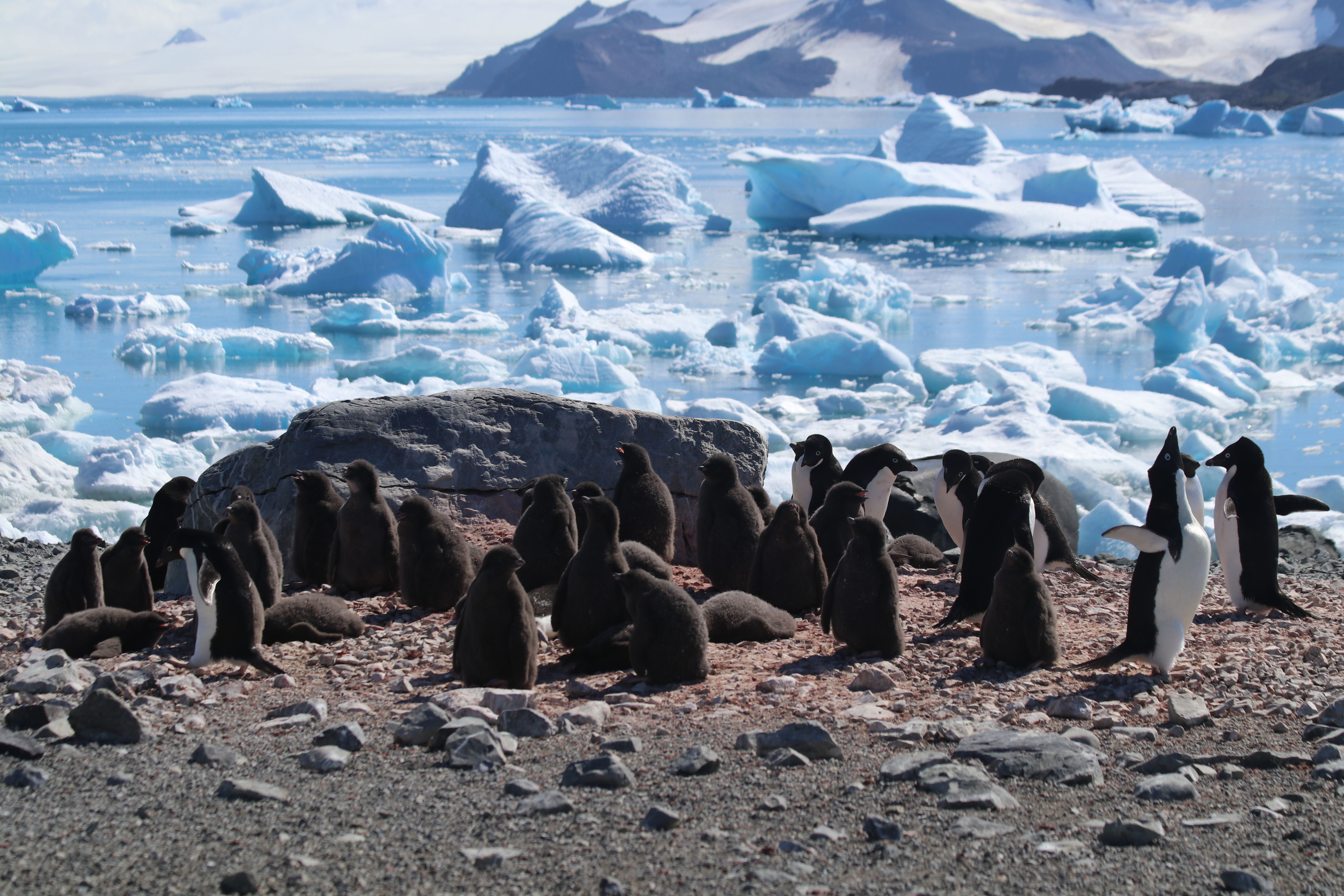 National Geographic Explorer transited through a field of tabular icebergs that blinked the sky white in a band of purple fog, reemerging into yet another sunny, surreal scene at Tay Head on Joinville Island. Weddell seals lounged and undulated on the beach near our landing. As we have become accustomed to seeing, glaciers lined any land in the panoramic distance. We hiked across volcanic barrens to the edge of this island’s ice dome, meandering around meltwater pools and giant petrel and skua nesting areas. We ultimately arrived at an Adelie penguin colony beside an orange, lichen-encrusted rocky outcropping with spectacular views above an ice-choked bay. Here, parent penguins tended fuzzy, brown, month-old chicks, occasionally protecting them from the advances of predatory skuas.