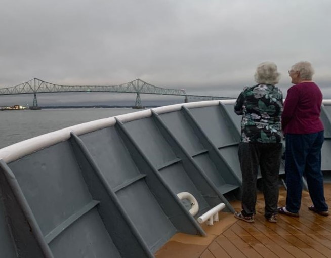 After lunch, some of us went for a gorgeous hike up Beacon Rock, while others visited Multnomah Falls and the Bonneville Fish Hatchery. Multnomah Falls is the largest in Oregon and the second largest in the country. Here we learned some tips for long exposure and took beautiful photographs. At the hatchery we walked the grounds and saw white sturgeon and salmon. As we returned to the ship we watched a beautiful sunset, with the moon rising over the hills. We were treated to a special dinner on the sundeck as we traversed the Bonneville Lock — the last of the eight locks we have passed through on our journey.
