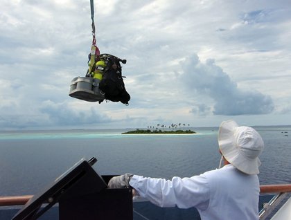 This morning we arrived at Huvadhu Atoll, the 10th largest atoll in the world. The scout boat left at dawn and reported back amazing underwater conditions on the outer edge of the atoll. After breakfast we boarded the Zodiacs and transferred out to the snorkel platform for our morning snorkeling adventures. When we entered the water we were amazed by the clear blue waters, huge plate corals that extended as far as the eye could see and the myriad of beautiful colorful fish swimming gently in the currents below. We were so mesmerized by the spectacular scene below us that before we knew it we had been in the water for several hours and it was time to head back to the ship for another delicious lunch prepared by Executive Chef Lothar and his galley team.