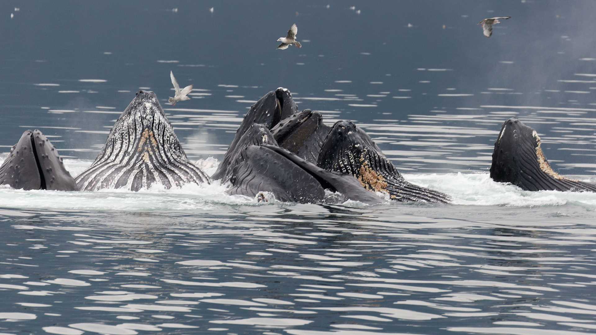 This morning each of us was gifted with such an experience. It began at dawn (0500) when the early risers ventured onto the bow and saw several whales. As the day and light developed, many of the whales started to form a group of 10-12 and began bubble-netting, the Holy Grail of sights for whale watchers. The whales were oblivious to our presence, sometimes drifting close to National Geographic Sea Bird and other times drifting further away. But the bubble-netting was beyond spectacular, especially as we frequently saw breaching whales in the background.
