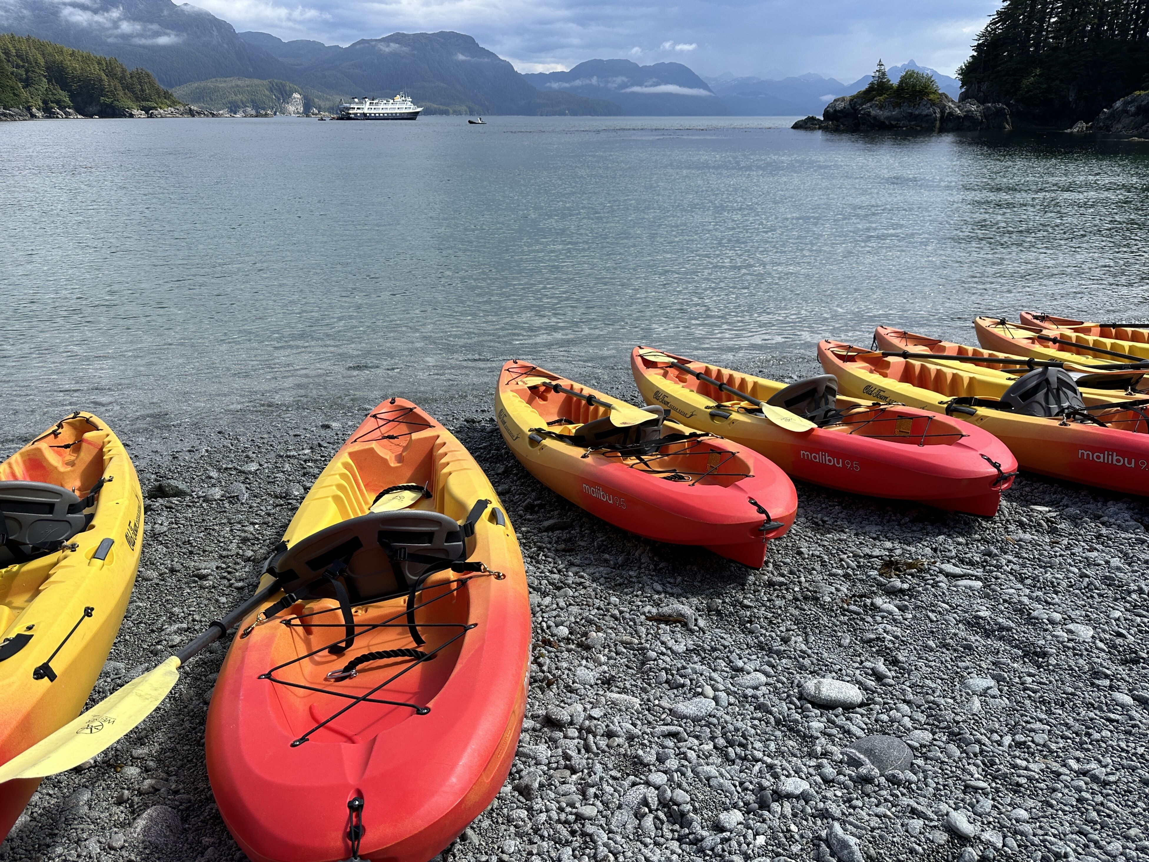 While many of us could have stayed on the beach all evening enjoying the picturesque cove, adventure called us onward. The sun continued to shine through the windows throughout dinner and afterward, as we enjoyed a night of trivia with naturalist Frankie and our fellow travelers. But trivia was interrupted because we spotted orcas! We watched several killer whales, mostly males, as the sun sank below the mountains behind us. We eagerly await another beautiful day in Southeast Alaska, hopefully with more magical weather and wildlife!