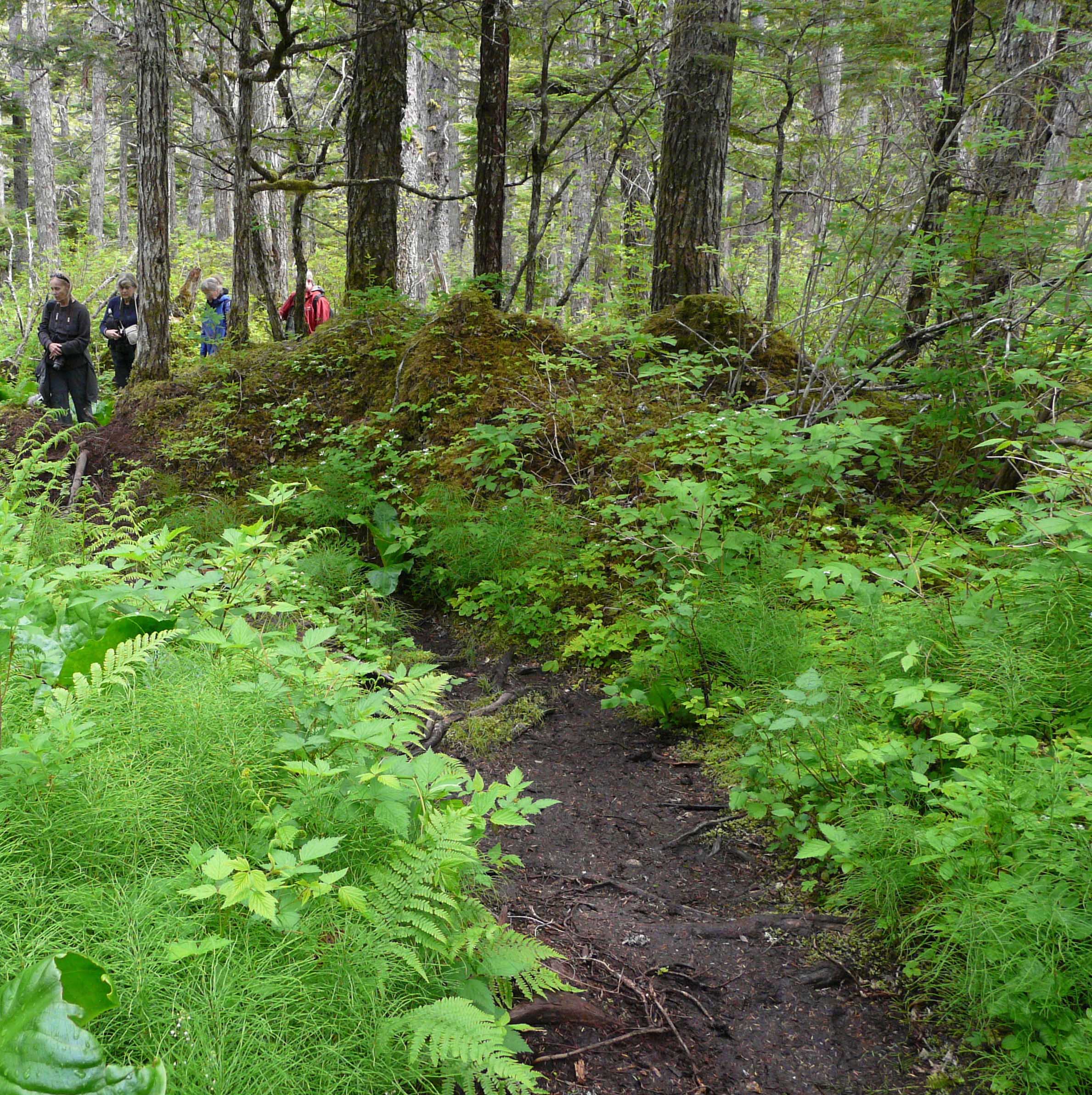 This morning was idyllic! Sun and sparkling water, waves and warmth. We zipped to shore for our first walk of the week along a boardwalk into the forest. Walkers headed up the trail amidst waving trees draped in lichen and abundant greenery all around. Skunk cabbage loomed large alongside us and moose tracks pocked the mossy carpet beside the boardwalk. Guests who opted for the longer hike reached a lake where sunshine blazed down and a red-breasted sapsucker was spotted. Yellow pond lilies dotted the edges of the lake and yellow cedar stood tall on the fringe of the wetlands. All in all, the morning was spectacular.