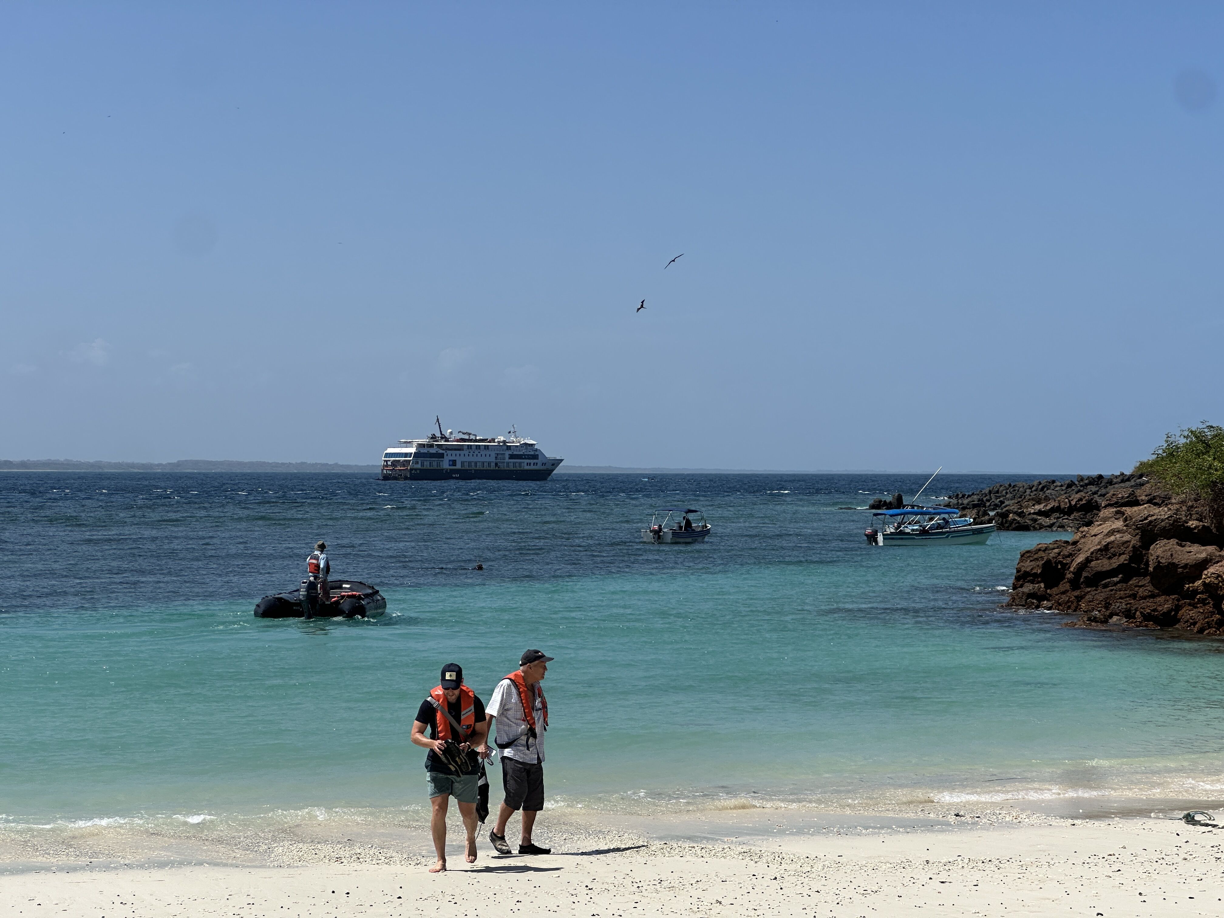 Eager to explore, we disembarked with our trusty Zodiacs and stepped onto the shore to walk along narrow trails, spotting iguanas basking in the sun and many magnificent frigatebirds hovering above our heads in the sky.