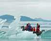 Various approaches to the ice were available whether the preference was air, land or sea. The leg-stretchers in our group took to a kilometer-long boardwalk which snaked through boggy tundra and past some of the earliest remnants of Inuit habitation in Greenland, dating back 3,000 years. The looming masses of ice just beyond the ridgeline kept the pace high, however, as everyone was eager to see the byproduct of our planet’s fastest flowing glacier. The end of the boardwalk terminated in gaping mouths as a continuous sea of broken-up ice 5 miles wide and 30 miles long dominated our view. Icebergs 200 feet tall rose out of the brash like skyscrapers while delicate arctic hare bells were in bloom at our feet.