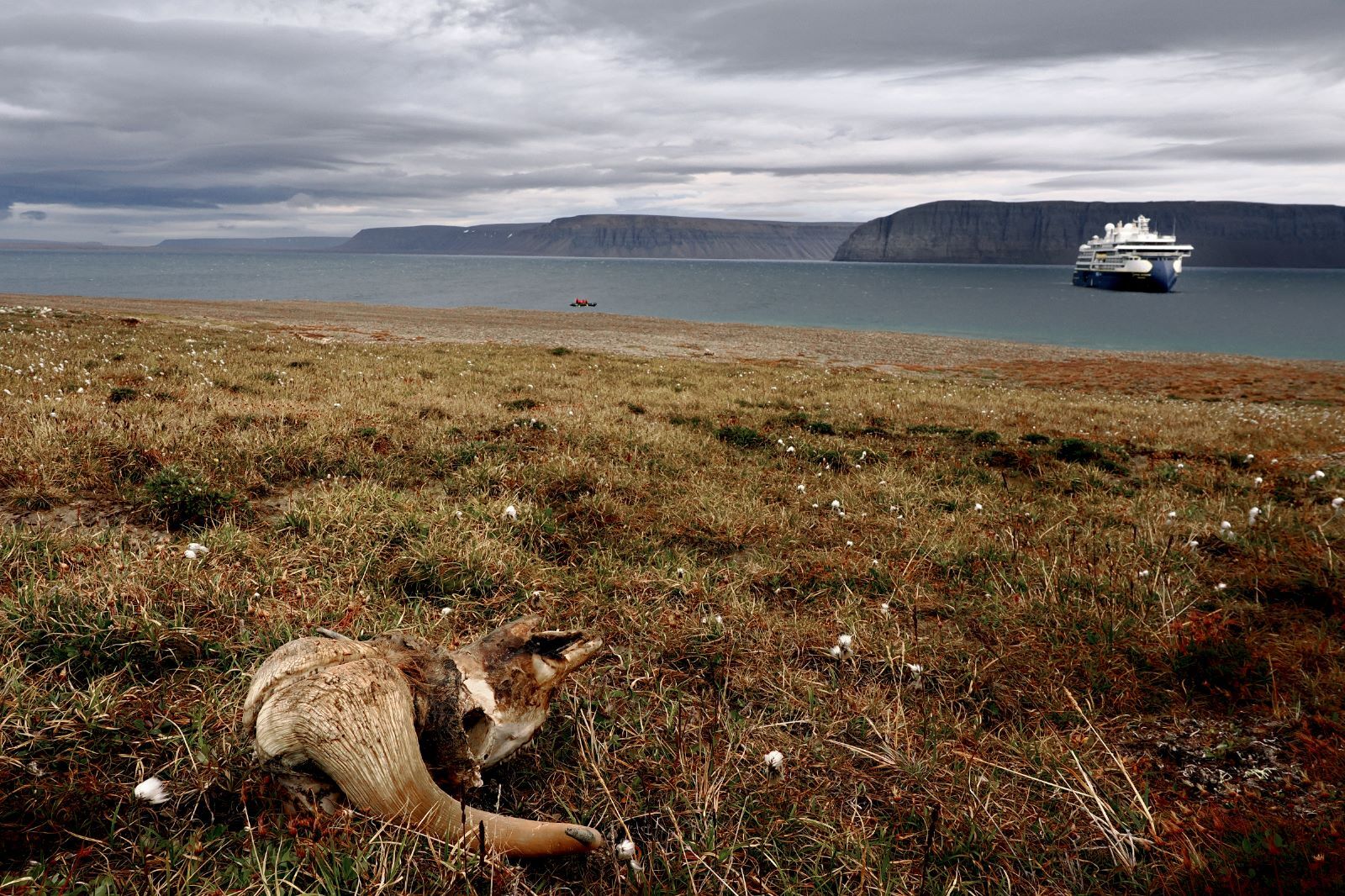 On our last expedition landing of the voyage, guests had the chance to visit Sydbay, the former site of the community of Sisimiut. Here we were able to see how this island has been continually inhabited since time immemorial. We viewed the remains of early Dorset housing, Thule tent rings, and sod houses standing alongside a modern Inuit seasonal fishing and harvesting cabin. It was not difficult to see what attracted people to this location for such a long time, as the landscape and seascape teams with a bounty of natural resources and traditional foods. Throughout our journey across Kalaallit Nunaat (the Indigenous name for Greenland) we were able to see the seasons begin to change. Even though we are just barely entering into late August, hints of autumnal colors, from browns and golds, to vibrant reds and majestic deep purples began to spread across the tundra. The beauty of the season made the island’s inhabitants, a colony of snow-white Arctic hares, stand out against the autumnal backdrop and black lichen covered rocks. A fine mist carried by ocean winds transformed this vibrant landscape into dreamy, muted colors that will stick with our guests long after our voyage is over.