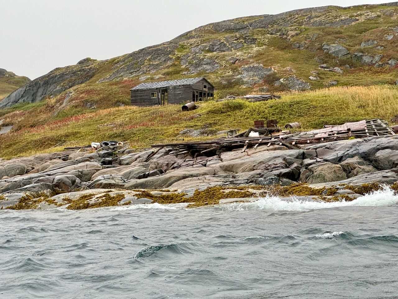 After a morning at sea, we arrived at our anchorage with a 20-knot wind blowing steady and rain following. Alright, no kayaking this afternoon, but there is a ghost town to explore. Right there, a few wooden builds that have lost all their paint. Right there, just below the hill, the hill with the polar bear at the top. Alright, no hiking this afternoon, but not to be thwarted, we take to the Zodiacs for a closer look!