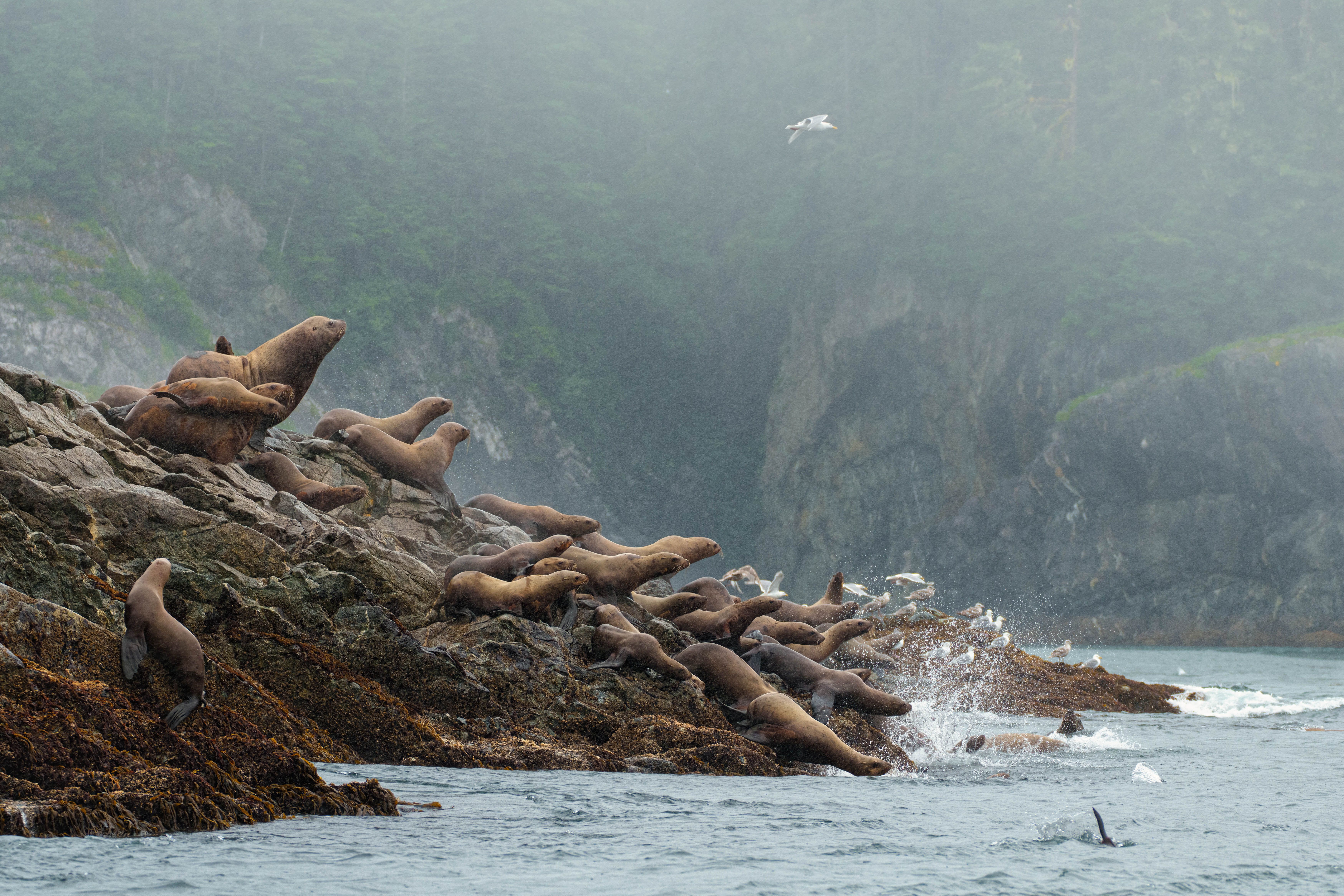 The Inian Islands are located between the open waters of the Gulf of Alaska and the protected waters of the Inside Passage. Marine life is abundant in this area of strong currents and upwelling, and countless salmon swim through here as they return from the ocean to spawn. We saw many Steller sea lions, sea otters, and seabirds around the islands. Later in the day, we visited George Island for walks ashore and kayaking…and a few hardy souls went swimming! Our day’s wildlife sightings continued after dinner as we watched humpback whales.