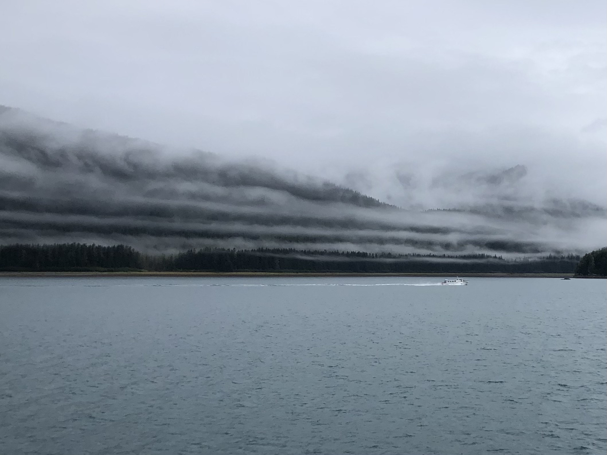 The clouds played across the foothills of the mountains, sometimes filling in the glacial valleys with soft white mist, while a humpback whale added the mist of its blow. Drizzle occasionally drifted down on us but out into the Zodiacs we went. The calm waters between the Inian Islands provided opportunities for sea otter to rest in bull kelp canopy. Our rides brought us out to the northern end of the Inside Passage. There the current was flowing fast. The pink salmon run was full on. Fish made their way to the streams of their hatching, struggling against the channel’s strong flow. This provided an easier opportunity for the sea lions to catch them. Heads of sea lions broke the surface with their mouths full of fish. Gulls and other sea lions headed toward the catch. Speed was important if the smaller sea lions wanted to swallow their catch. Then, to our amazement, killer whales arrived. Stealth and fast, the five killer whales surfaced then disappeared. And that was just the morning!