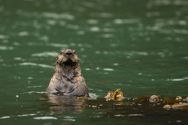 Today we woke up enjoying some really nice Southeast Alaskan weather, with cloudy skies and calm waters, as National Geographic Venture arrived in the Inian Islands. Located in Icy Strait between the large Chichagof Island and Glacier Bay National Park in the mainland, the Inians are a small archipelago in the middle of one of the main entrances to the Inside Passage. They create a bottleneck-effect, and the waters gain speed as the tidal currents flow through them, bringing a lot of food to a variety of hungry creatures. Moreover, what better way to explore the region than by boarding our Zodiacs? We spent a wonderful morning admiring the abundance of life around the islands, and everyone had the opportunity to watch and take photographs of many creatures. Sea otters are particularly abundant in the waters around the Inians and we marveled at their incredible fur, which at more than one million hairs per square inch, have the highest density of hair known in the animal kingdom.