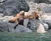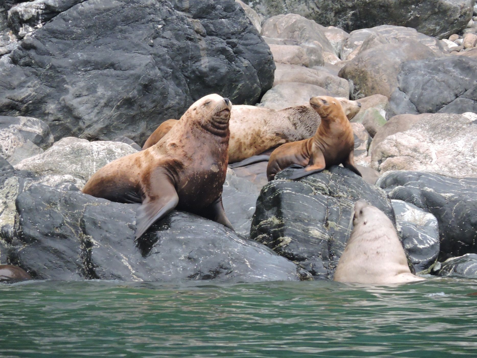 Steller sea lions were seen in large numbers, and we had the pleasure to watch their antics as they swam around our boats, giving us the chance to appreciate their immense size and understand why they are the largest sea lion species in the world. The bulk of some huge males resting on shore was readily apparent. However, no sea lion grows as big as the animal that we encountered today, the humpback whale! Several humpbacks were swimming very close to the islands and we all had an amazing time admiring those majestic cetaceans and marveling at their size and elegance. What a treat!