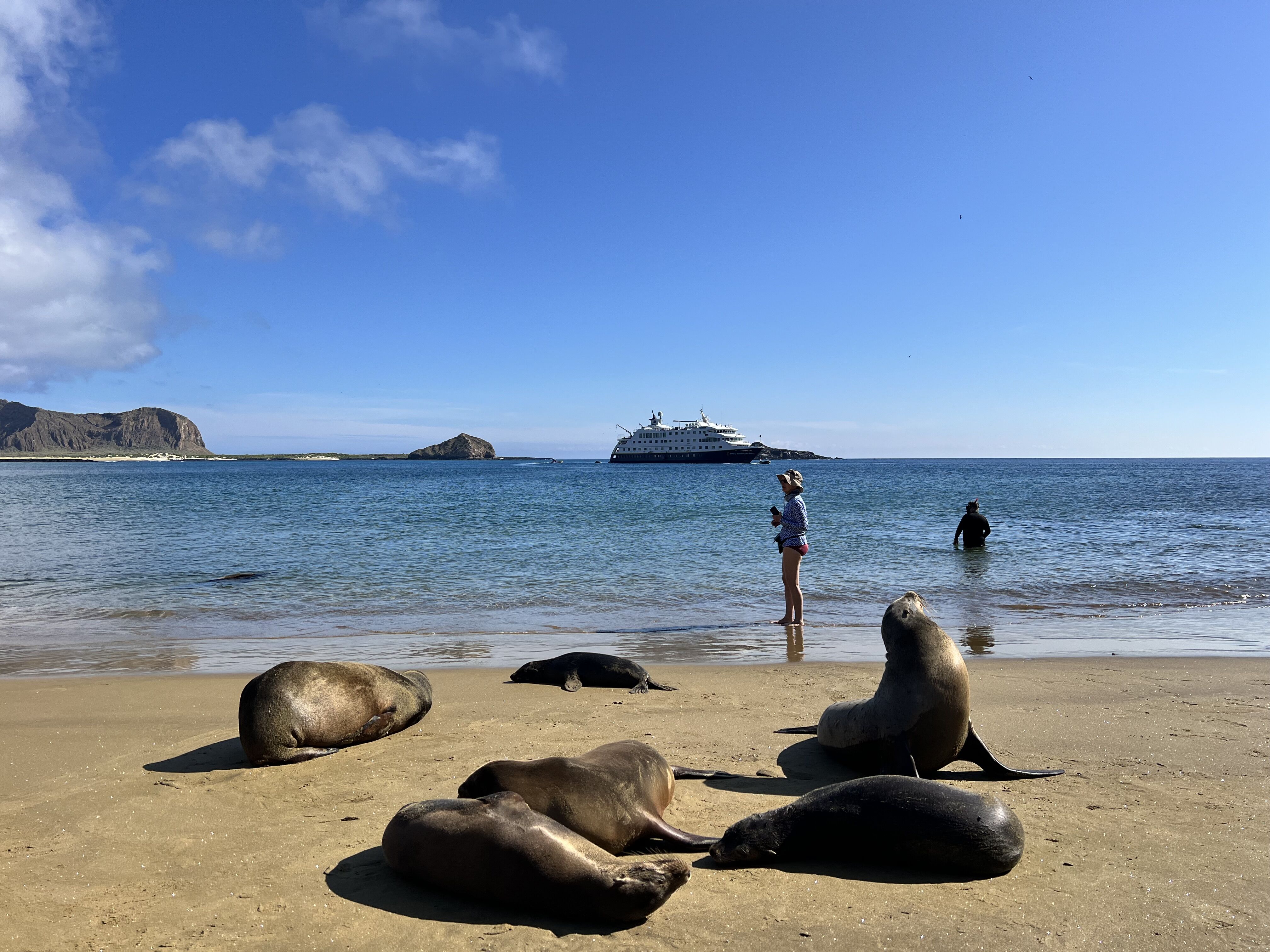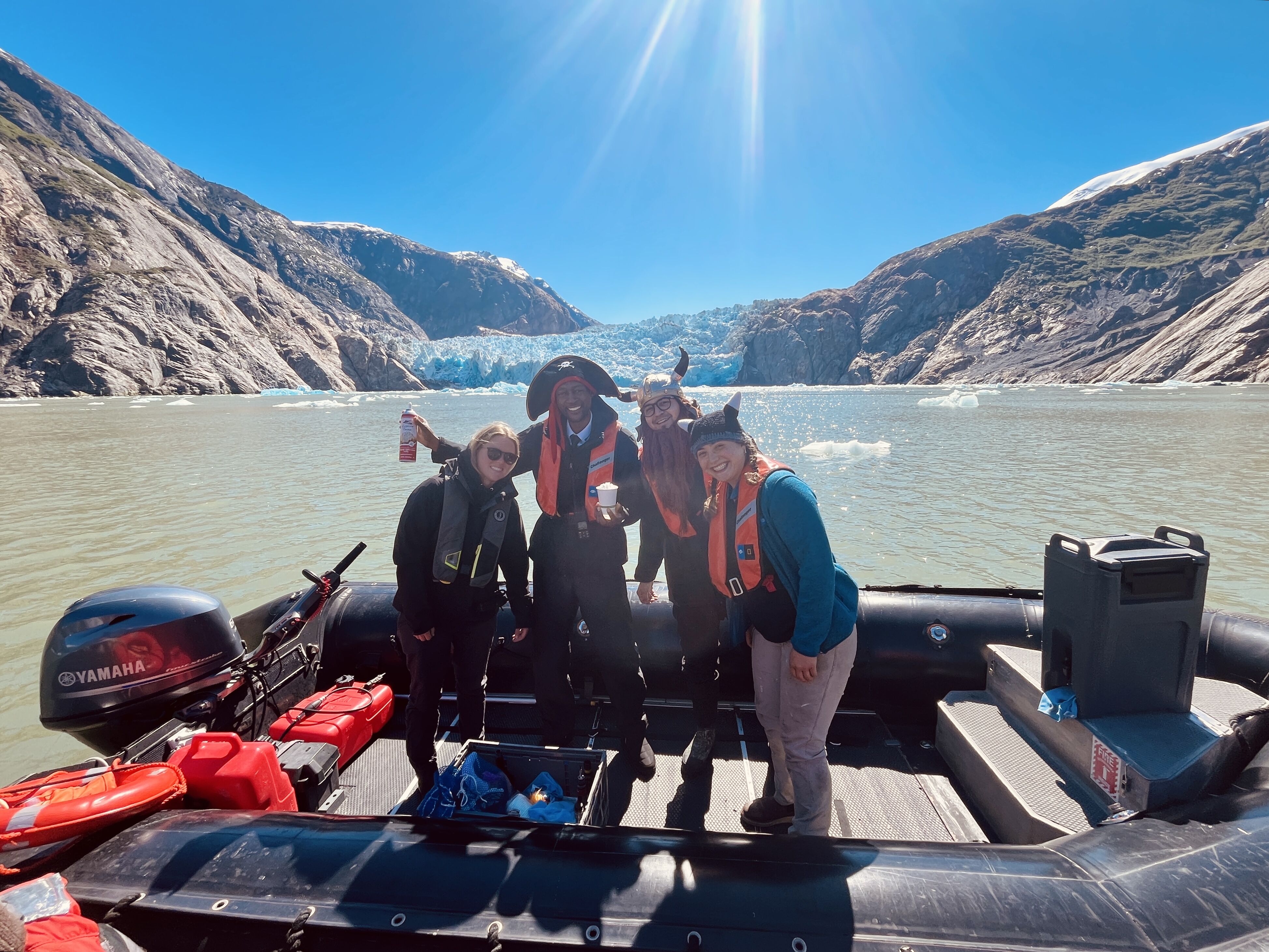 Today was a triple ‘WOW’ day! We awoke to calm, clear, and sunny conditions, highly unusual for the coast of Southeast Alaska! After dropping anchor, we embarked on Zodiac cruises past sea otters lounging in kelp beds. We timed our arrival at a narrow passage just as the tide began to rise. The power of the incoming tide creates vigorous vertical water motion such that fish are rapidly forced to the surface. Ravenous sea lions quickly captured the fish as they rose, surfaced with them in their mouths, and tossed them back-and-forth to manipulate for swallowing, thereby creating small pieces instantly captured by the ever-watchful gulls. Adult and juvenile bald eagles, as numerous as pigeons in a park, swept down to snatch fish floundering helplessly on the surface. Our cameras and eyes continuously scanned the frenetic feeding frenzy for photo ops and mental memories. Before leaving, we spotted a pod of five orcas that formed a perfect foreground to a background of the impressive snow-covered Fairweather Mountains. Truly postcard quality!