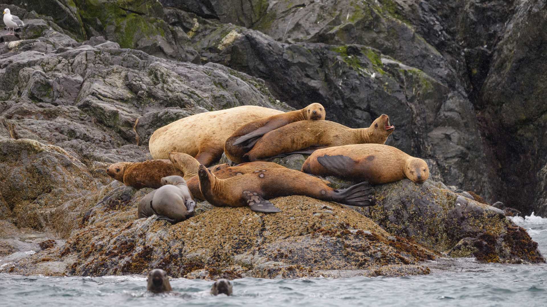 Navigating the channels in our Zodiacs, we watched as pigeon guillemots, pelagic cormorants, gulls, and bald eagles soared overhead. The ever-productive waters of these islands produce plenty of baitfish for all these species – and more – to enjoy. The lively scene continued as we came across a colony of Steller sea lions lounging on rocks and playfully swimming around us. Their antics and distinct calls added to the fascination of our expedition.