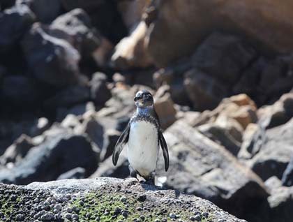 Back on the ship again we wiggled into our wetsuits and returned to the Zodiacs to snorkel in a calm bay near where we were anchored. This snorkeling outing was marvelous! Such a variety of wildlife in the water with us! Where else on earth can one snorkel with animals from four different orders: mammals, reptiles, fish, and birds all swimming and diving around us!