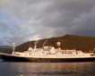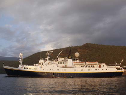We arrive at Punta Vicente Roca and had a Zodiac ride, where we were able to spot Galapagos penguins and flightless cormorants nesting along the coast. This is also an outstanding visitor site with stunning geological features, not only tuff (compacted volcanic ash) and rusty lava with odd shapes, but also the titanic cliffs that sheltered the National Geographic Islander, anchored in the shallow waters.