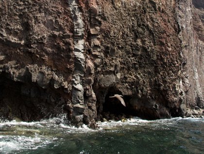We woke early while navigating in the northern hemisphere along the north coast of Isabela Island. In the distance we could see the volcanoes of Wolf and Ecuador and later we could see Fernandina, the youngest Island in the archipelago. No cetaceans were sighted but we enjoyed seeing several species of sea birds including storm petrels, shearwaters, dark-rumped petrels and frigate birds. We also saw a mola sun fish, a few leaping mobula rays, a flying fish and fur seals returning from a night of fishing. After a hearty breakfast we gathered in the bridge and watched the GPS tick down to 0.00 as we crossed the equator and travelled back into the southern hemisphere. Soon the captain dropped the anchor of the National Geographic Islander at the base of dramatic cliffs of Punta Vicente Roca.