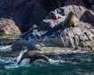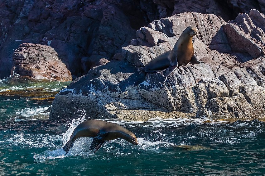 Relatively small and low compared to neighboring Santa Cruz, North Seymour is located to the north of Baltra. The island is dry with predominantly low shrubs, like prickly pear cacti. The incense trees are bare during the dry season. Seabirds like frigatebirds and blue-footed boobies nest on the island, and sea lions rest on the sand when they are not fishing. Land and marine iguanas also live here. Rabida is in the middle of the archipelago and has a striking red sand beach. We observed a small colony of sea lions of all ages resting or nursing. Behind the beach, American flamingos nest in a brackish lagoon. This island is full of contrasts and wildlife that we enjoyed observing during this day of expedition.