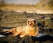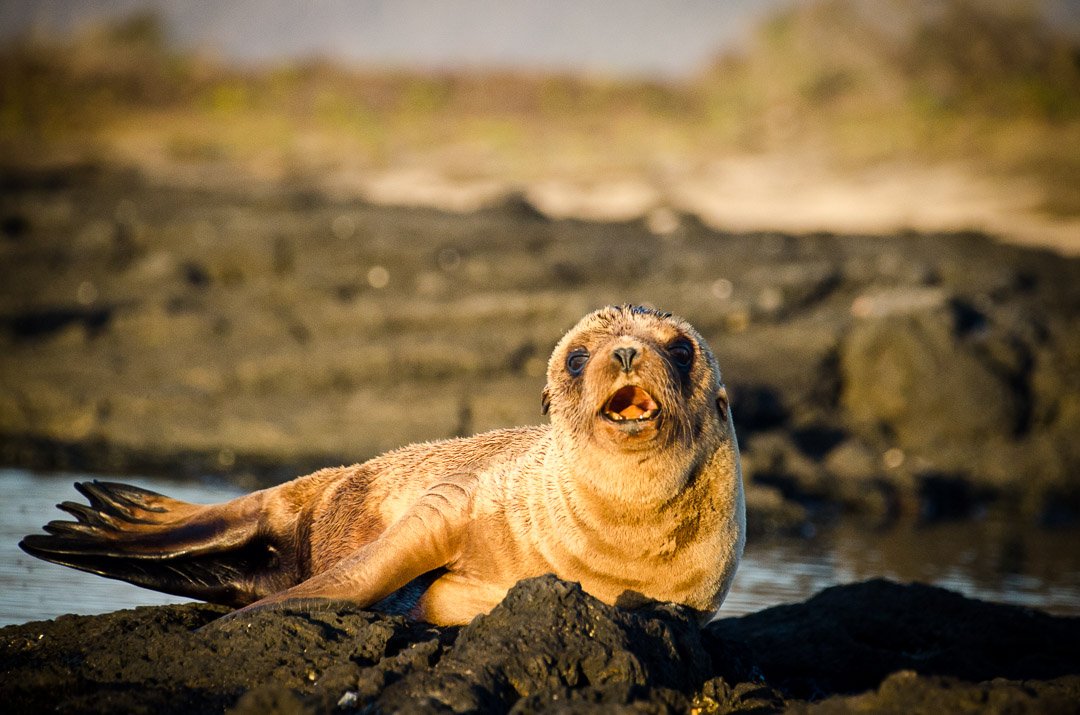 We had two hike options this morning and chose between a long, fast two mile hike led by Vanessa on a loop trail along the coast, over lava boulders, past uplifted coral heads, then inland and ending back on the beach. Naturalists Celso and Cindy took guests on the one mile walk and on both hikes everyone saw several large, bright yellow land iguanas. Some of us found a “giant” tortoise nearly tucked out of view – but, it was far from giant, as it was only a few years old! We were hiking at the base of Volcan Alcedo this morning and because of the dry conditions the giant tortoises are mostly on the top of the crater this time of the year! So, we were surprised and happy to find this little fellow.