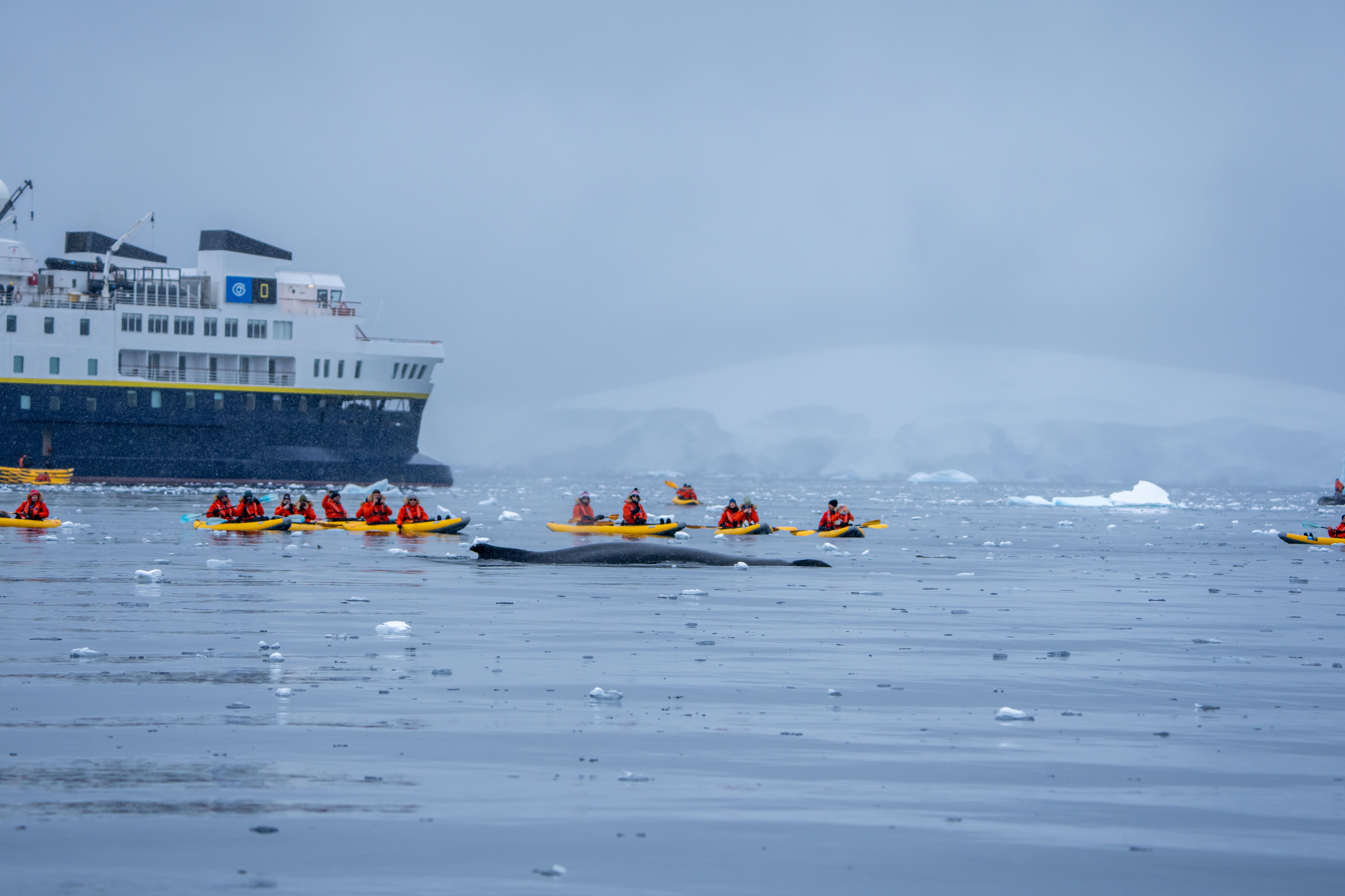 Our action-packed first full day began with killer whales cruising by the ship at sunrise during the transit north to Isla San Marcos. Guests enjoyed brief glimpses of the orcas as they surfaced in the distance with a gorgeous, orange-pink sun coming up over the horizon.