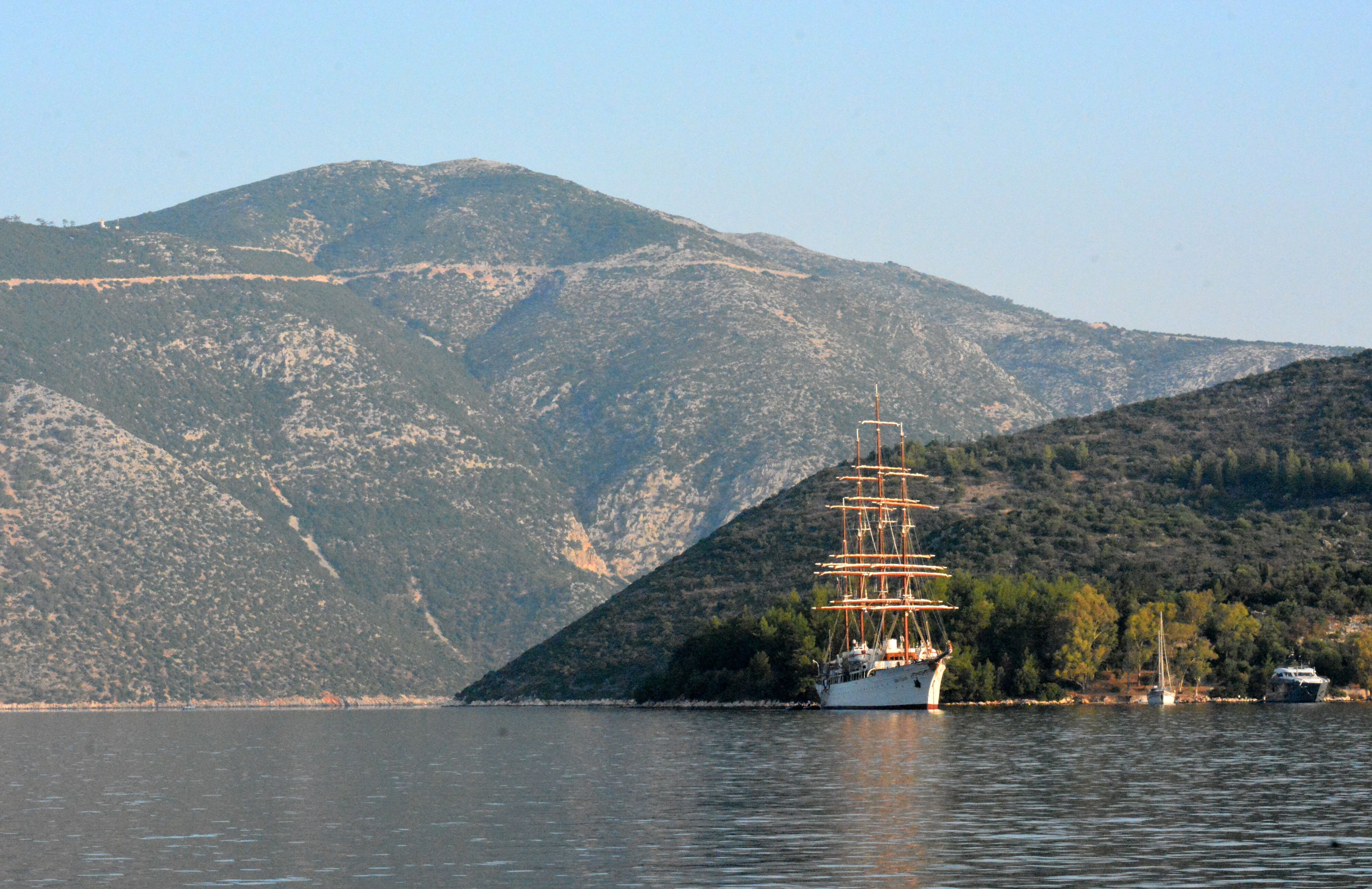 Sea Cloud entered the peaceful, scenic harbor of Ithaka, Greece this morning at sunrise. The steep mountains surrounding the small, serene port were clothed in green hues of pine, olive, and cypress. The waters were still and mirror-like, reflecting the modest collection of whitewashed buildings collected along the waterfront. After breakfast, we used the Zodiacs for the first time as tenders for the short ride to shore. We boarded coaches for the half-hour trip up the mountain to a Greek Orthodox monastery, where we enjoyed a tour of the church with its collection of icons and frescoes. Our guides, Eleni and Smaro, gave us wonderful explanations and told us the history of the island, famous for being the home of Odysseus, the mythical hero of Homer’s Odyssey. After some free time in Ithaka town, we returned to the ship for lunch on the Lido Deck. Later, we had the opportunity to go in Zodiacs to see Sea Cloud under full sail. Before dinner, Allan gave a lecture on Olympia, tomorrow’s destination, as we continued our journey.