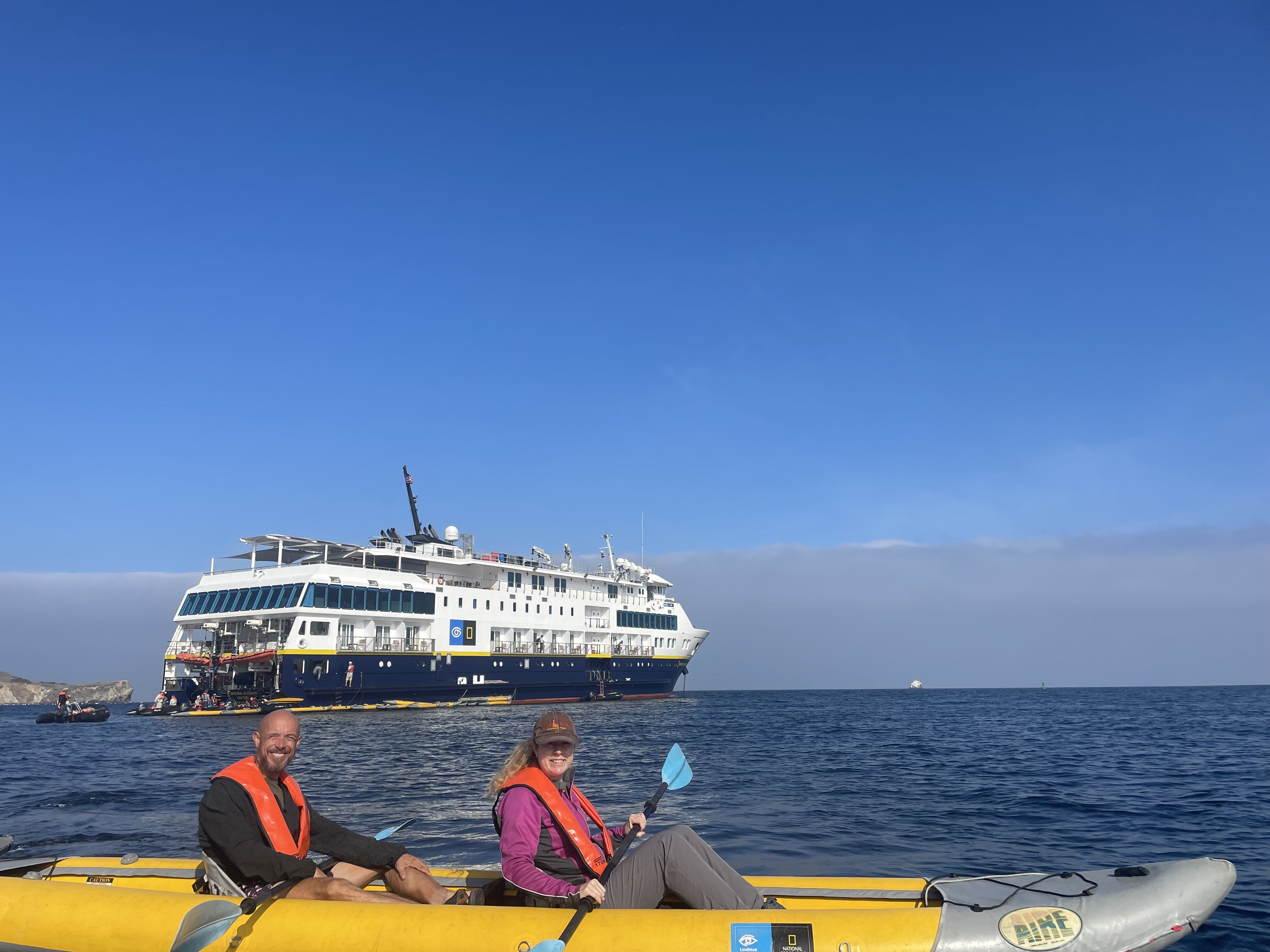 We were up before sunrise this morning to watch the pink glow as it descended over the mountains and glaciers around us. A short hike brought us to the foot of Bernal Glacier just when the colors were at their most brilliant. We had a second opportunity to stand in awe as we contemplated the sheer power of ice needed to carve this beautiful landscape. Back on board, we stretched our minds in an abstract direction with a workshop on the use of watercolor to document our expedition from Naturalist Shannon Malone. Our timing was planned around our passage through the Kirke Narrows. We needed to pass through at slack tide to navigate the strait, which is barely three times the width of National Geographic Explorer .