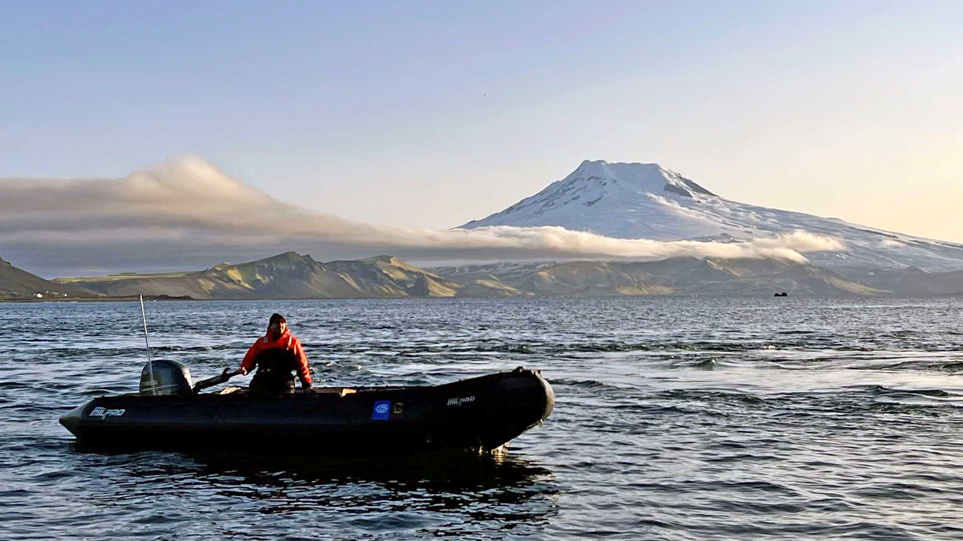 In the middle of nowhere, between mainland Norway and the east coast of Greenland, is a little island called Jan Mayen. The location is unusual, the geology and human history are special, the weather conditions are generally rough, and the lack of sheltered landing sites makes Zodiac landings impossible much of the time. The probability of a full, calm day of sunshine on Jan Mayen is low. But this morning, we won the lottery! Just before breakfast, the sun appeared over the horizon. Jan Mayen, a volcanic island on the Mid-Atlantic Ridge, has a characteristic triangular mountain – Beerenberg – which is almost constantly hidden behind clouds. Today was one of those rare occasions when the whole of Beerenberg was visible in its majestic grandeur, decorated only with a tiny, scarf-like cloud around the lower part. Many guests seized the moment out on deck as National Geographic Endurance made her gentle approach over calm water. Expedition leader Russ announced over the PA system, “We will make a landing!