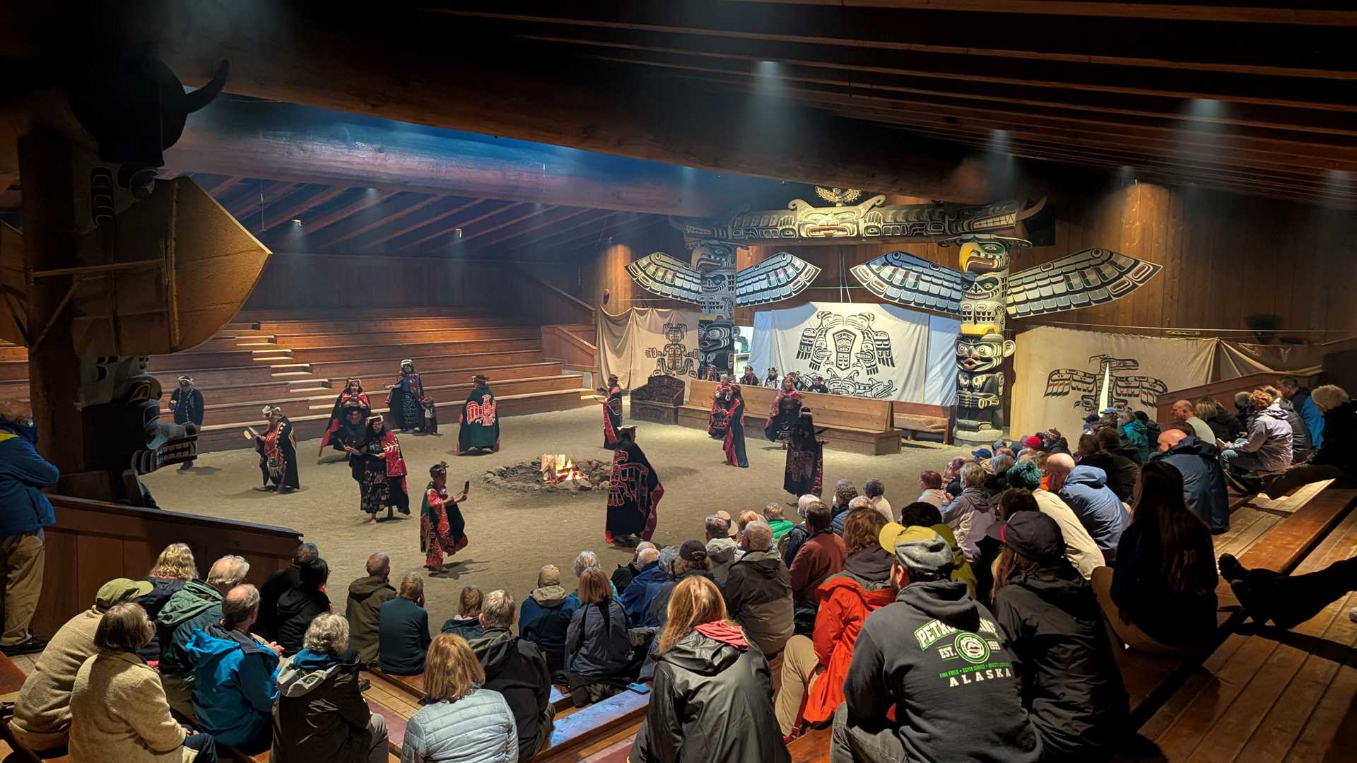The rain showers slowed as the gangway was lowered, and we took to the streets of Alert Bay. On foot or by bus, we made our way to U’mista Cultural Center. Enriching artifacts lined the walls for us to see, while outside we heard tales from a master carver and got to witness the artist in his element. A truly unique experience awaited us in the big house. Dancers in well-detailed regalia stomped and twisted in concert while the white smoke wisps weaved in the spaces between us and a nearly forgotten culture. The tribe invited us down for one last dance, and as we walked out the doors of the big house, wonder and joy reflected on our smiling faces.