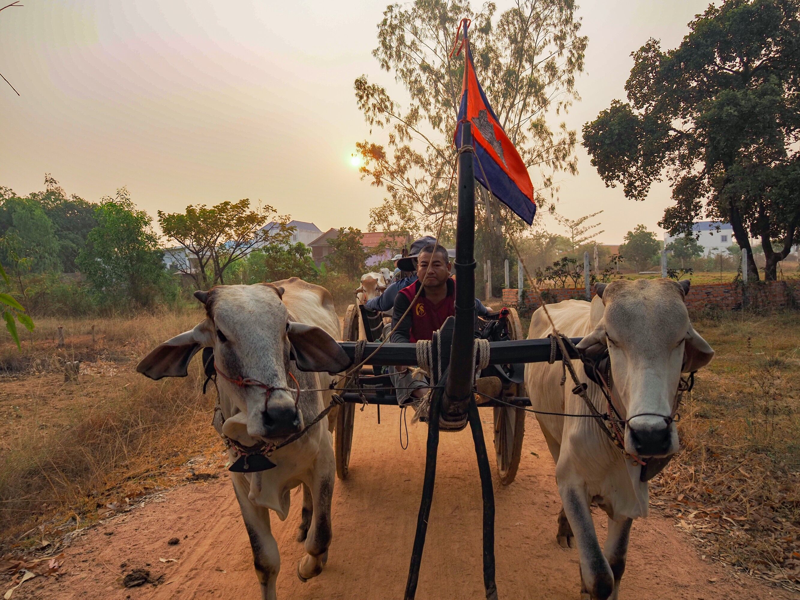 Our day began before sunrise along the banks of Kampong Tralach on the Tonle Sap River. The morning was cool and humid, with a faint mist veiling the distant fields. With makeshift steps carved into the clay, we climbed the embankment and met up with our morning transportation – a column of ox carts to take us for a ride through the rice fields. Like rice agriculture, these utility vehicles are an enduring part of Khmer agrarian life. When we arrived at the Green School, we learned how this community organization is empowering rural youth with English language and computer skills. And we had fun and games along the way!
