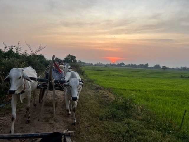 This morning, we woke up early to get ready to travel by oxcart! Each oxcart could host two people, and we went for a ride in the countryside to visit the rice fields. We learned a lot about rice production and enjoyed the beautiful scenery. Everyone will remember these moments!
