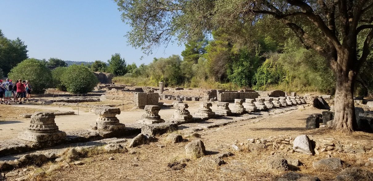 The wild landscape of Olympia and blooming oleanders welcomed us. Guests asked many questions as we trained in the gymnasium and the palaestra (wrestling center), prayed at the temple, and “sacrificed” Max—the youngest male in the group—to Zeus! After our visit to the ancient archaeological site, the museum revealed its treasures. We admired the Hermes of Praxiteles, the Nike of Paionios, and the amazing pediment sculpture of the Temple of Zeus.