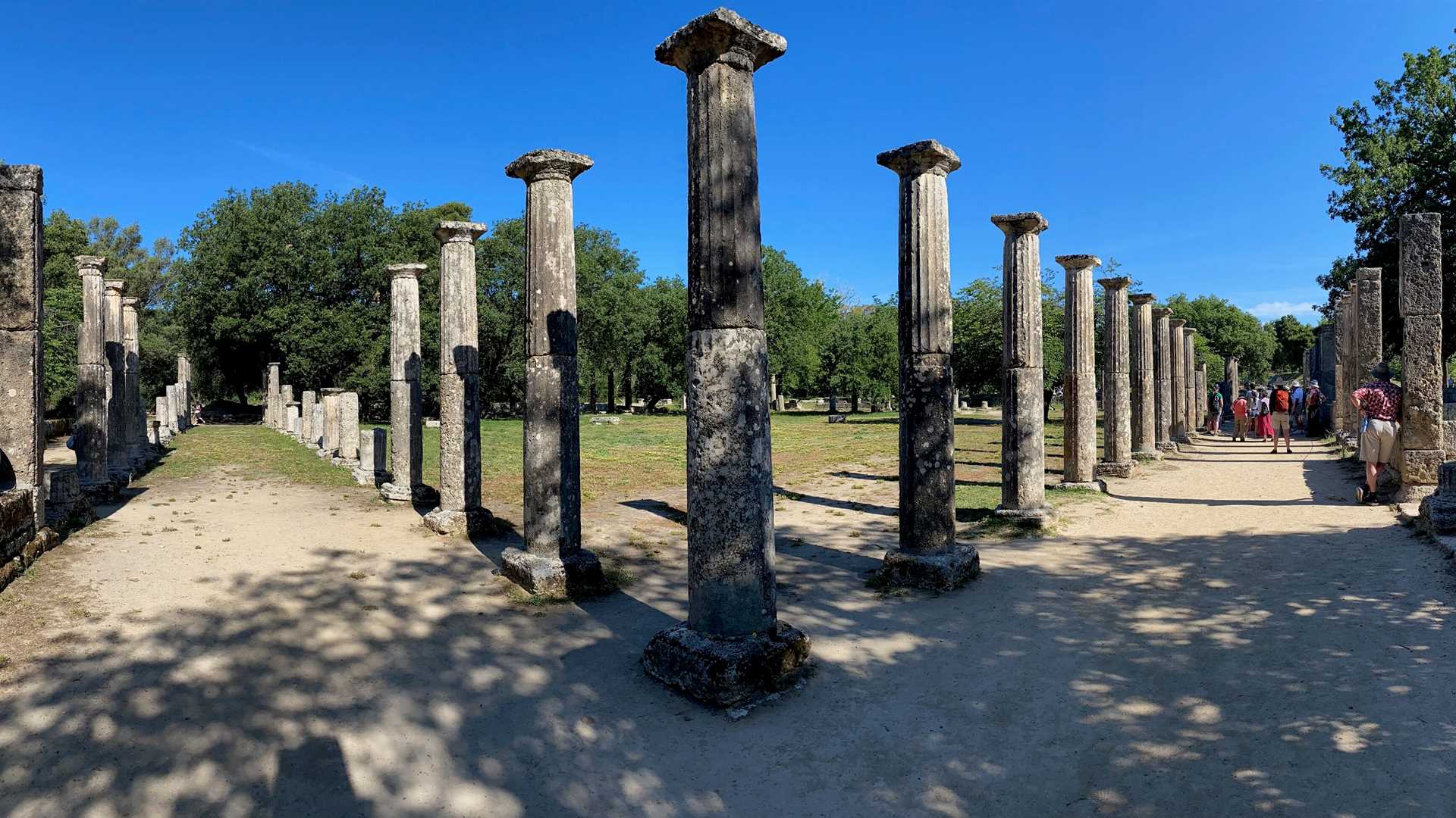 Sea Cloud arrived this morning at Katakolon, a small port town of the western Peloponnese. Fortunately, ours was the only ship at the pier, and this boded well for our upcoming visit to the archaeological site and museum of ancient Olympia. After breakfast, we boarded coaches for the thirty-minute drive inland through the green and lush early summer landscape to arrive at the site of the original Olympics. Guides Gemma and Effie first took us to the archaeological site and explained the histories of the games and of the religious sanctuary. We made our way through the Palestra and entered the sanctuary area, viewing the remains of the Philippeion, the Temples of Hera and Zeus, the Nymphaeum, and the treasuries. We continued into the ancient stadium where many of our guests posed for pictures at the starting line of the Olympic races. Some guests even participated in an actual footrace down the length of the stadium in the glorious Olympic sunshine and heat of the midmorning.
