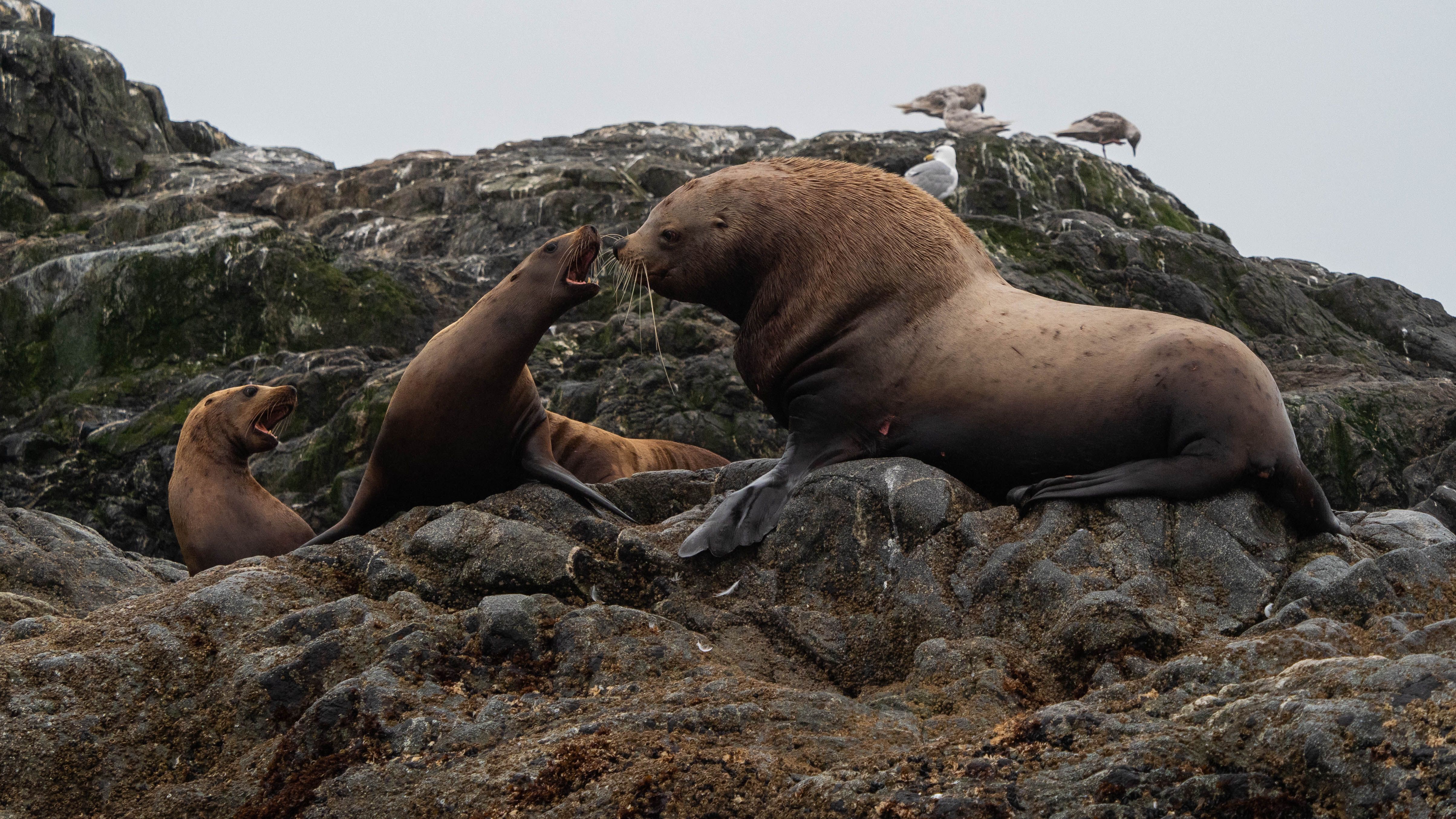 We came to Alaska in search of the charismatic megafauna and untamed landscapes. Our first full day of exploration along the rugged coastline of the Inside Passage did not disappoint. We began our morning by sailing through Peril Straight, en route to our afternoon anchorage at Kelp Bay. We didn’t make it far before spotting a coastal brown bear foraging in the intertidal zone. Later, humpback whale plumes filled the air. As we approached, we counted 6… 7… 8… 9 spouts gathering around a rocky reef known as Morris Reef. The whales began to dive simultaneously, and they came to the surface several minutes later in a group lunge. The whales were exhibiting an incredible behavior known as bubble net feeding, wherein each whale performs a specific role to corral bait fish so they can feed together. We watched for an hour as the whales repeatedly dived and surfaced with their mouths wide open. The naturalist team described what was happening beneath the surface of the water. We didn’t want to leave, but by lunchtime we were on our way to Kelp Bay. We hiked in the temperate rainforest and kayaked in the protected waters of the bay’s middle arm. Bald eagles perched in the canopy of the spruce and hemlock, completing our dramatic introduction to the landscape that we will spend the next four days discovering.