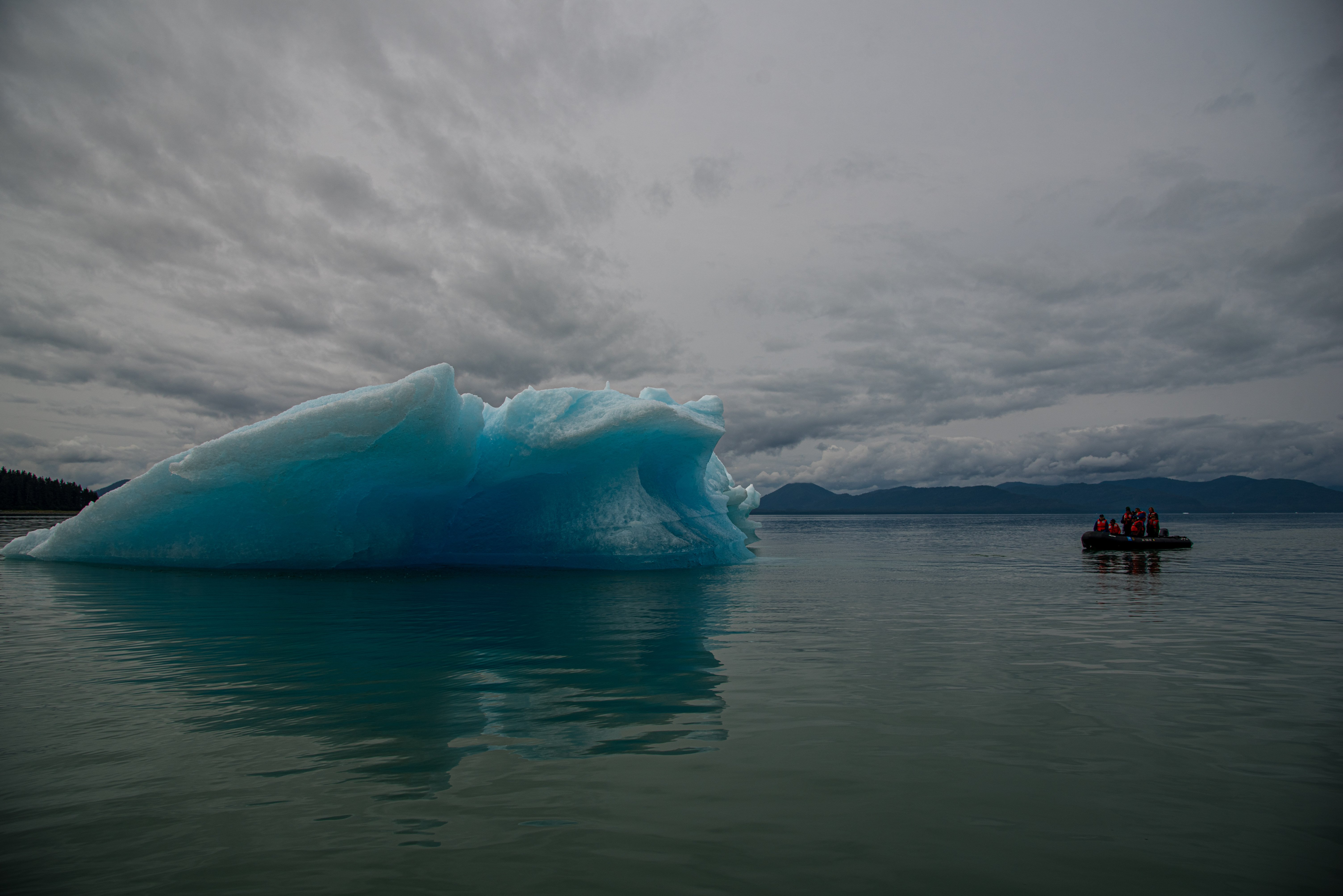 Just as breakfast ended, the calf began to breach and tail slap as it waited for its mother, a perfect Southeast Alaska picture completed by layers of islands and mountains behind it. Some of us hopped into kayaks to explore the mouth of a salmon stream, catching glimpses of bears fishing for salmon and harbor seals resting on a sand bar. Others went out in Zodiacs to watch the humpback whales and came upon one sleeping at the surface, breathing every few minutes.
