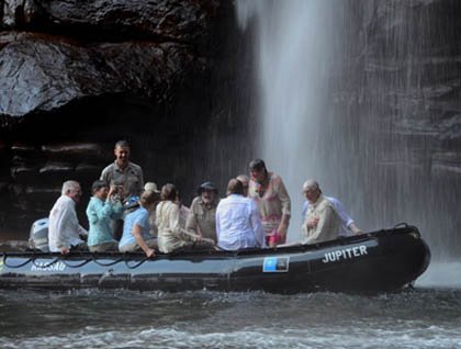 With our expedition leader Darrin Bennett leading the way, we trekked up the steep track to the plateau from where we made our way to the top of King George Falls. The view was stunning and the clicking of camera shutters could be heard constantly. We saw the Zodiacs cruising along the sandstone walls, our fellow guests peering upwards in awe and the Zodiacs leaving a white trail of foam as they journeyed to their destination at the end of the gorge.