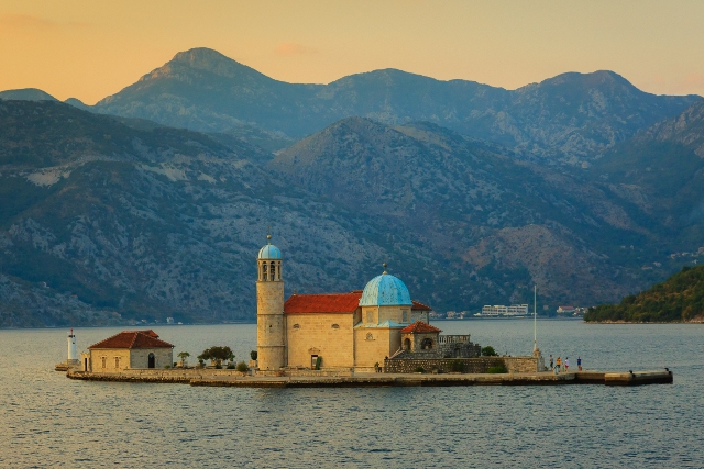 Our magical day in Montenegro began early in the morning, as Sea Cloud entered the picturesque Kotorfjord. As we disembarked in Kotor, the bright sunlight filtering through morning mist formed a stunning backdrop for the ship’s golden eagle figurehead. We first set out for the small bayside town of Perast. Taking a local tender, we visited the Church of Our Lady of the Rocks, built on a small manmade island in the center of the bay. Built to house a sacred icon found floating in the bay in the 15th century, this church boasts numerous votive offerings as well as a stunning coffered ceiling painted by Montenegrin artist Tripo Kokolja.