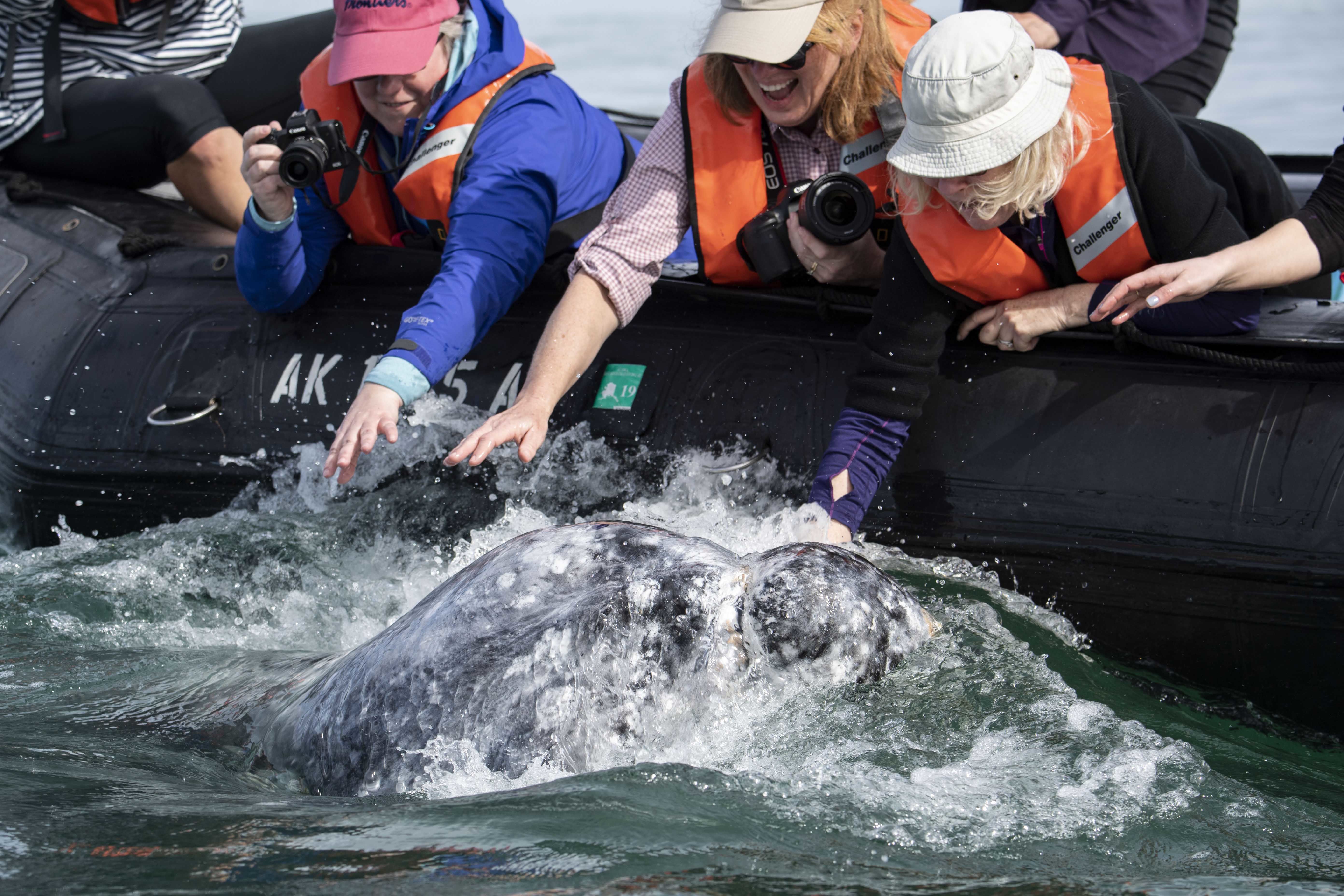 Today we woke with the shining stars and took Zodiacs ashore to meet our coaches for a trip to Chale, a small town on the shores of Magdalena Bay. The goal was to find some wintering gray whales, magnificent leviathans which frequent this coast to give birth before the long migration back to their Arctic feeding grounds. These whales did not disappoint! Spyhopping, breaching, and even a bit of tail flukes. As a result, there were lots of smiles and laughter all around! We returned to the town for lunch and then headed back out on the local boats for a second round. As we returned to the ship, the sun set over La Paz, with glassy waters of gold in the harbor, and pink clouds above. The constellations of Orion, Taurus, and the Pleiades shone over our Zodiacs on our way back to dinner aboard National Geographic Venture .