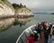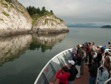 The last day of our expedition in Southeast Alaska started in a great way, with a beautiful brown bear sow walking by herself on the beach; we all watched her from the ship and only whispering and camera clicks could be heard around. Eventually the bear retreated into the forest and we continued navigating. And all this before breakfast! Brown bears are very common in Southeast Alaska, particularly in the so called “ABC” islands –Admiralty, Baranof and Chichagof – and it is common to see them quietly foraging on shore eating grasses or looking for barnacles, clams or other marine creatures in the intertidal zone at low tide. In a little while, they will congregate around the myriad of salmon streams in the area to feast on the bounty of the five different species of salmon that return to their native freshwater realms.