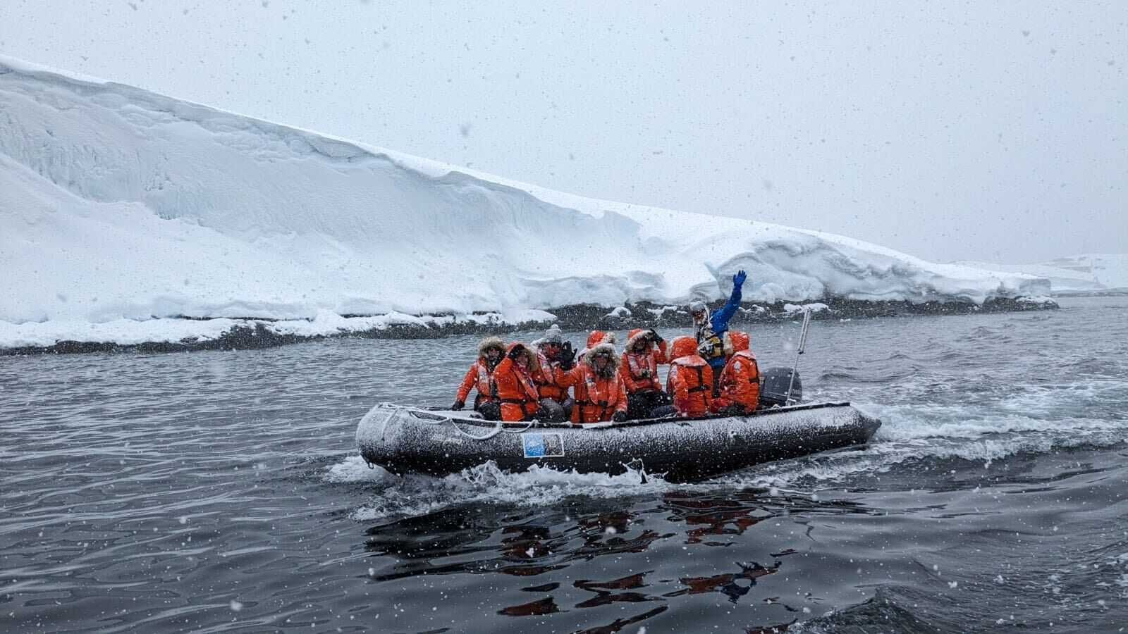 Today National Geographic Explorer reached the White Continent! For many guests, this was their seventh and final continent. An exciting yet frigid morning greeted National Geographic Explorer and her guests in Crystal Sound. The horizon was blanketed in a carpet of dense fog, and fat and fluffy snowflakes drifted down from above. Along with dark, gray, choppy waters, this was the morning scene as the captain and his bridge staff searched for the perfect spot in Crystal Sound for the morning’s activities.