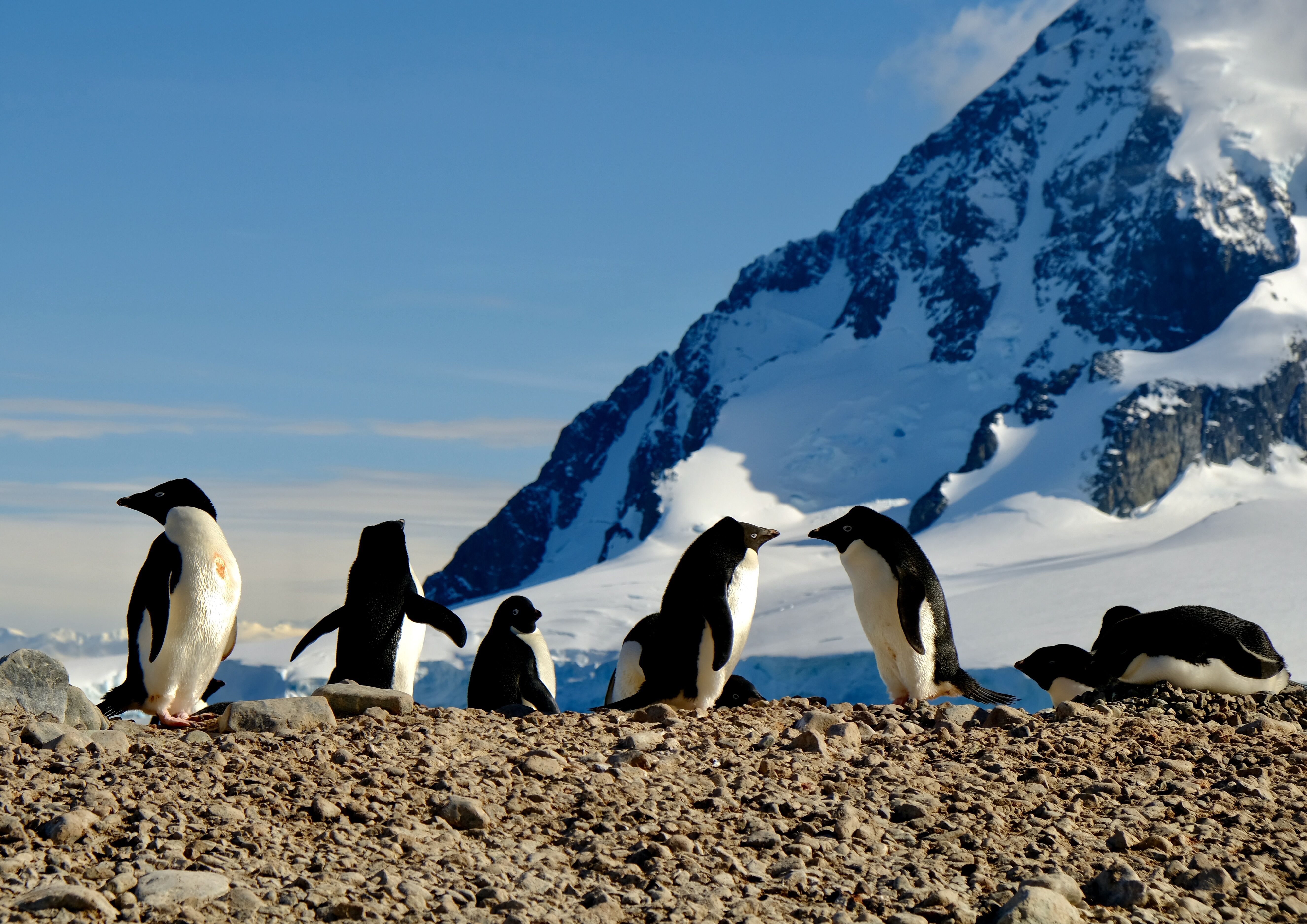 Before breakfast and from the north, our ship approached the famous Lemaire Channel. The narrow channel is ornamented with magnificent black cliffs on both sides. The cliffs stick out of a steep glacier belt at low elevations. The clifftops were hidden by overcast clouds. The channel is so narrow that a large iceberg could completely block the passage. Luckily, all icebergs within the channel were small or medium-sized, and National Geographic Endurance made it through. At the southern exit of the channel, we spotted Pleneau Island, our destination for the morning landing. A shallow sea near the island trapped hundreds of icebergs driven by wind and currents until they were grounded. Two of them were especially remarkable. One was in the shape of a bridge. An opening in the iceberg was decorated with huge icicles. From one side, guests on the Zodiac cruise could take an ice-framed photo of our ship. The second massive iceberg had an enormous cave that was carved by ocean waves. The cave was about 30 meters high at the entrance and about 50 meters deep. A landing at the island and Zodiac cruises were offered to guests. Pleneau Island is home to about 3,000 pairs of nesting gentoo penguins. The island is almost completely covered by ice and snow except for multiple small, smooth rock outcrops that protrude through the snow. These clear openings were used by nesting birds.