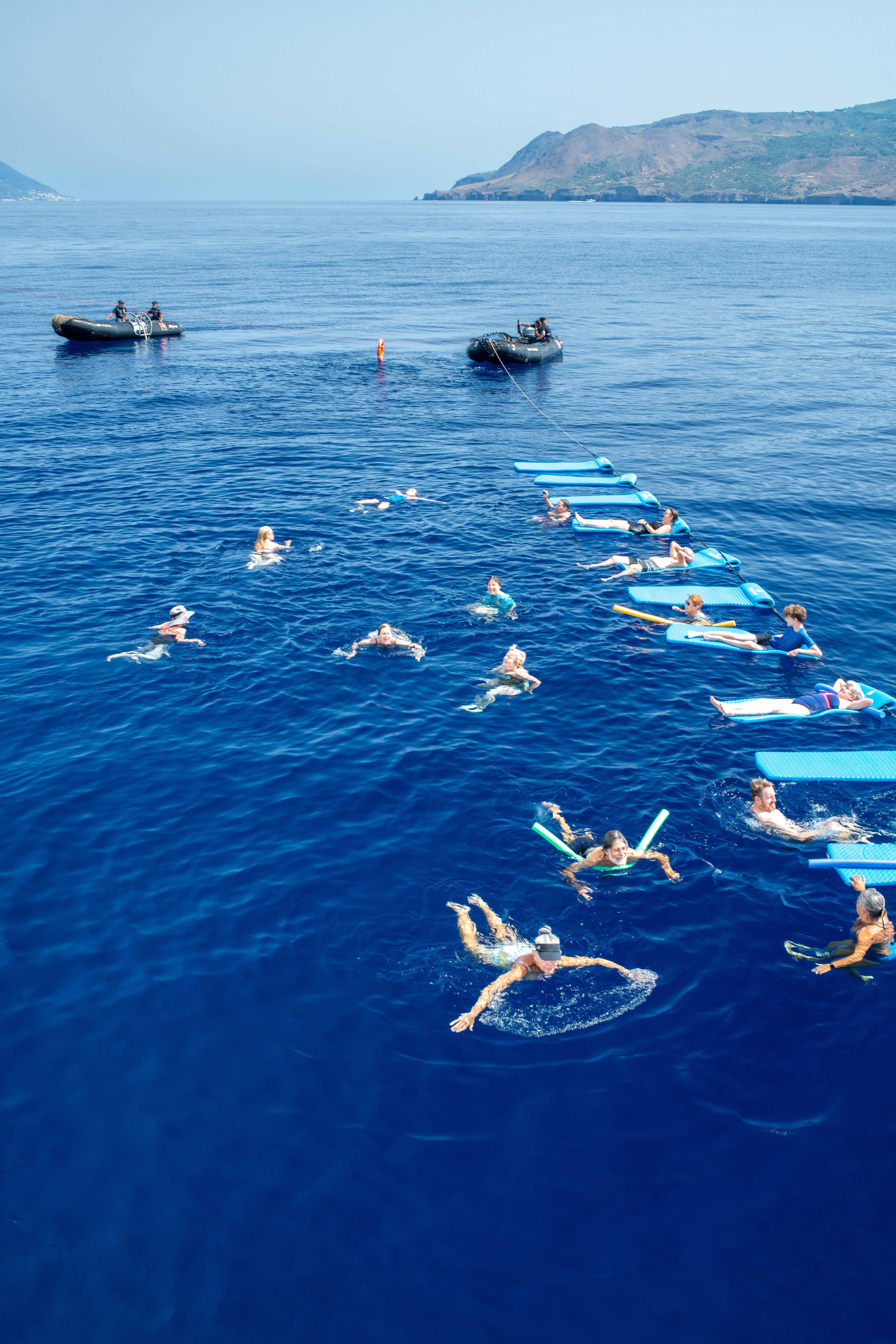 After the talk, at 10:30 A.M., we had a swim in these fabulous waters. The water was crystal clear, warm, and the high salt content made it virtually unnecessary to move. You just bobbed up and down. I didn’t count how many were in the water, but it appeared most of us took advantage of this chance to swim right off Sea Cloud. The swim was restorative and perfect.