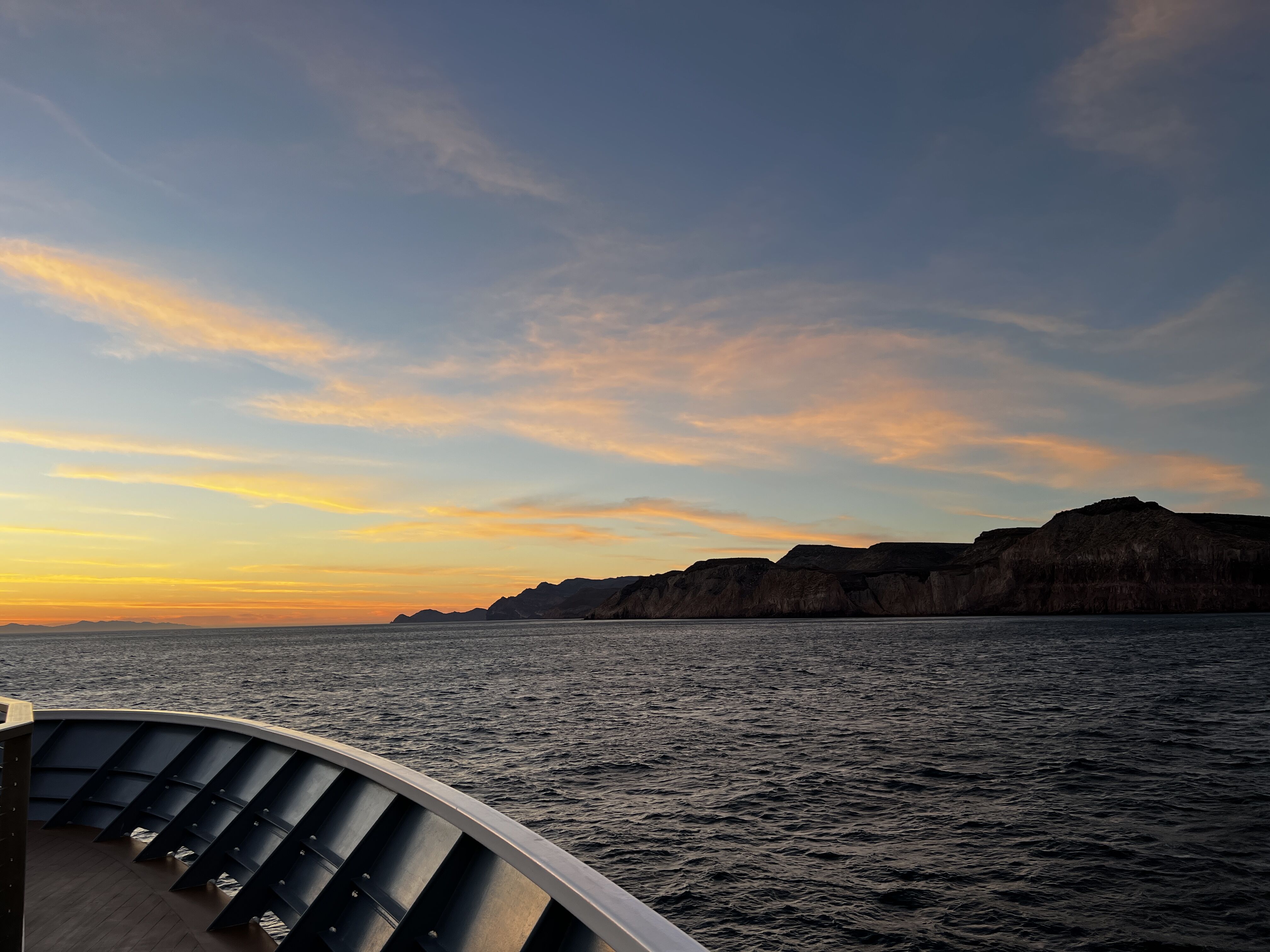 Under a rose-colored sky, we began our day alongside Los Islotes, a rocky island near La Paz. This area is known for the high number of endemic and enchanting creatures that grace its shores, such as yellow-footed gulls, California sea lions, and a variety of whales and dolphins. Before brunch, we took a deep dive into the world of birds with a talk from naturalist Shayne Sanders. We learned that green herons bait fish by tossing morsels of food in the water. The herons wait, watch, and then lunge. Talk about innovation!