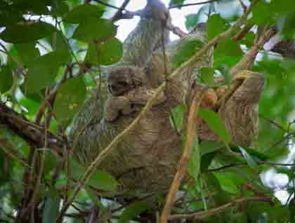 We continued walking for a short distance when we saw a three-toed sloth with a baby. What an opportunity for all of us; not only did we get the chance to see the two different species but also to photograph a mother three-toed sloth with a baby, a unique and special surprise for all of us.