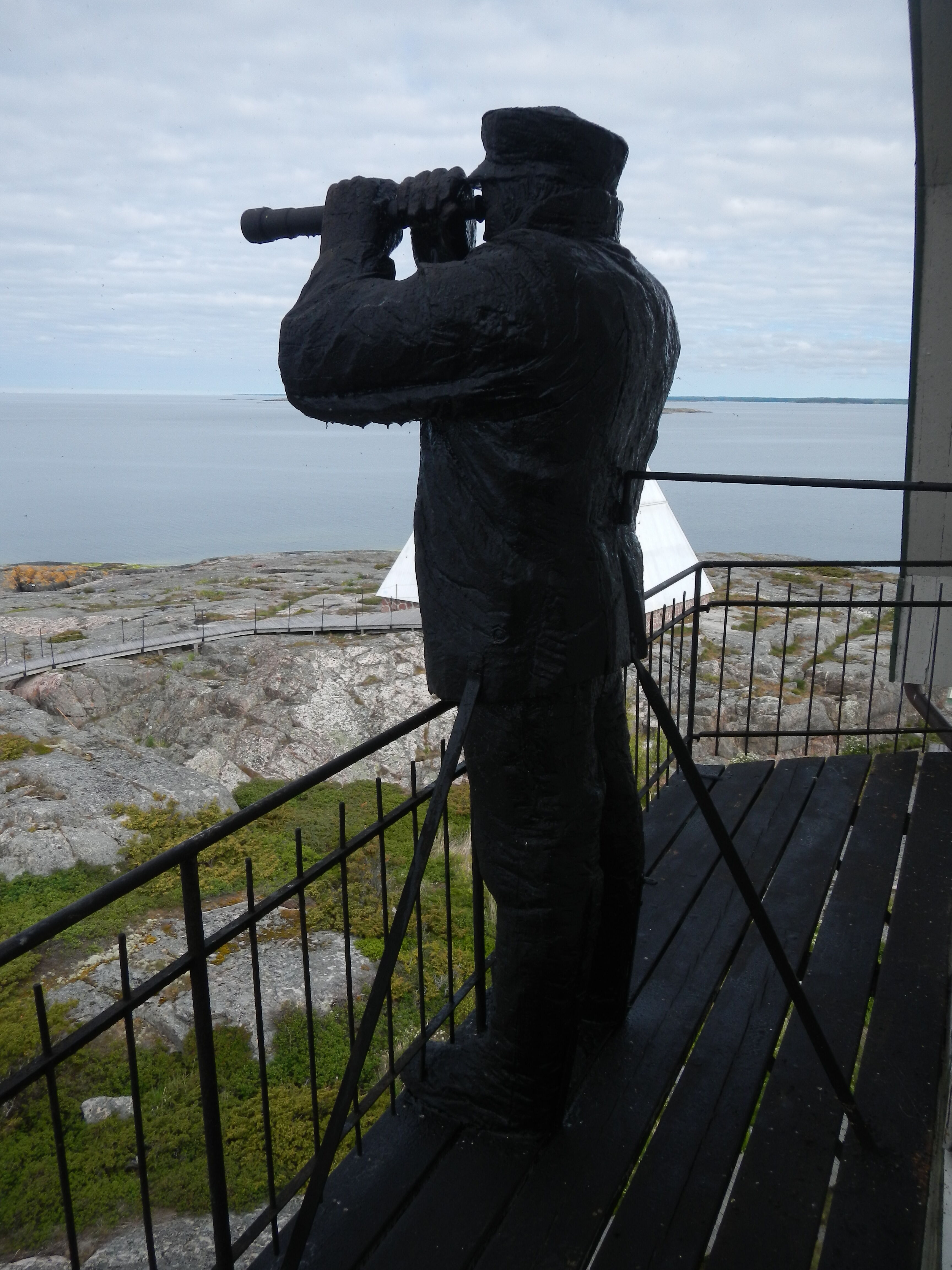 On our Zodiac cruise, we transited south down the now well-marked channel. We arrived at the small island of Kobbaklintar and docked at a small pier. We met a local resident who is working to restore the pilot’s house and outbuildings that were abandoned in 1972 when the pilots moved to Mariehamn. At its height, the pilots’ house would have supported a chief pilot, a few senior pilots, and several junior pilots, all waiting for the many ships that visited Mariehamn every day. Today the conditions were perfect, sunny, and clear; in the winter, the site can be whipped by the Baltic winds, or totally obscured by pea soup fog. After WWII, the pilots installed spar buoys along the sides of the channel. Originally made of wood and now replaced by steel channel markers, the buoys make the channel much easier to find. When the weather turns bad, however, pilots are still used and are mandatory for occasional visitors like National Geographic Explorer. Under the guidance of one of the local preservationists, Rune, we visited the pilot house and its gigantic foghorn.