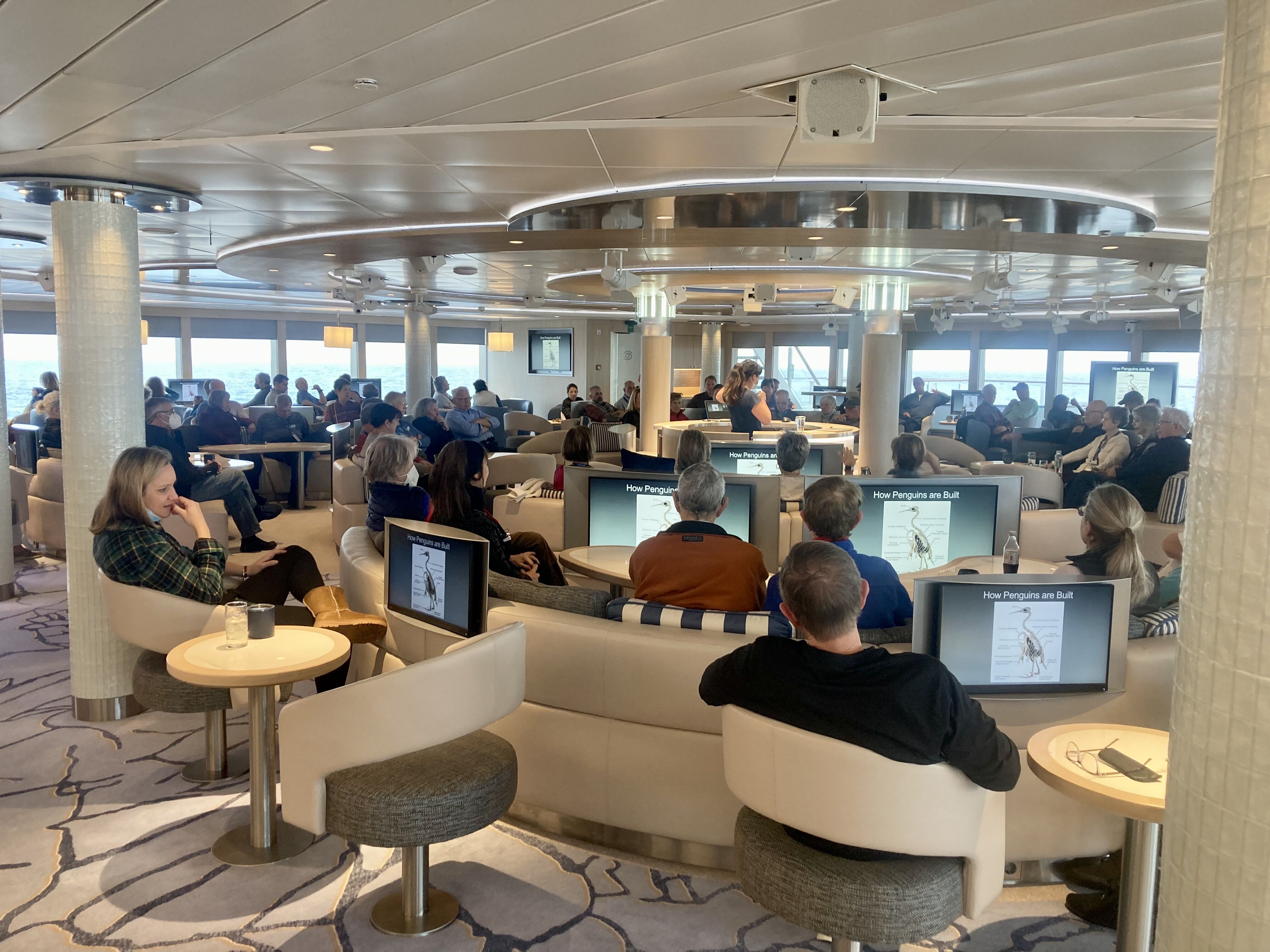 During our second day on this journey south, the ocean surprised us with calm seas as we finished crossing the Drake. Our morning was spent learning about the penguins of Antarctica and the protocols we need to follow while traveling in this majestic place. Each passenger brought personal items to be inspected and cleaned by the staff, who made sure there were not any unwelcome travelers, such as seeds or contaminants, on mittens, boots, or pants.