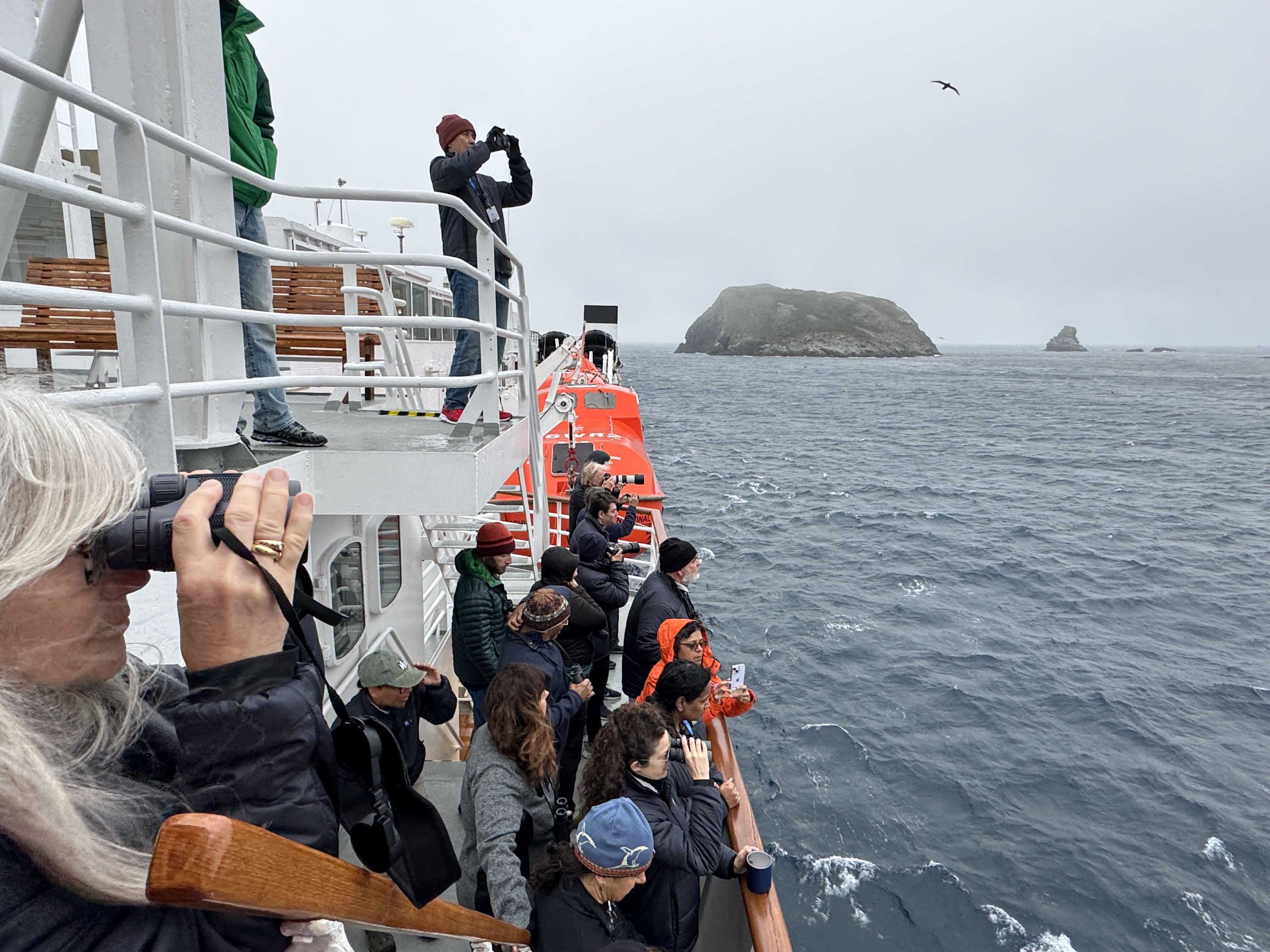 This morning, we had a later start than usual after a late night enjoying the crew show. Our galley team gifted us with a fulfilling brunch. We then had a brilliant forum about climate change with the participation of our panel of experts onboard. Afterward, our expedition leader called us to the bow to see Cape Horn, which was only a few miles ahead. The good weather allowed us to have a smooth and fast crossing, allowing extra time to swing by Cape Horn, the most southern tip of the Americas. Over the PA system, Steven provided a very interesting description of the historical importance of this area, then Pablo read a beautiful poem, a memorial to the seaman lost at sea. We could see the monument in the distance, two metal sheets that depict an albatross in flight. During the afternoon, we enjoyed Madalena’s presentation about Women in Antarctica. This was an incredible voyage through the struggles and delays of allowing women to participate in science and logistics in Antarctica. We entered the Beagle Channel around 17:00 and we encountered black-browed albatrosses, cormorants, dolphins, and whales. On our final approach to the beautiful city of Ushuaia, we passed by Les Eclaireurs Lighthouse and some of the seals that live in the Bridges Islands Archipelago.