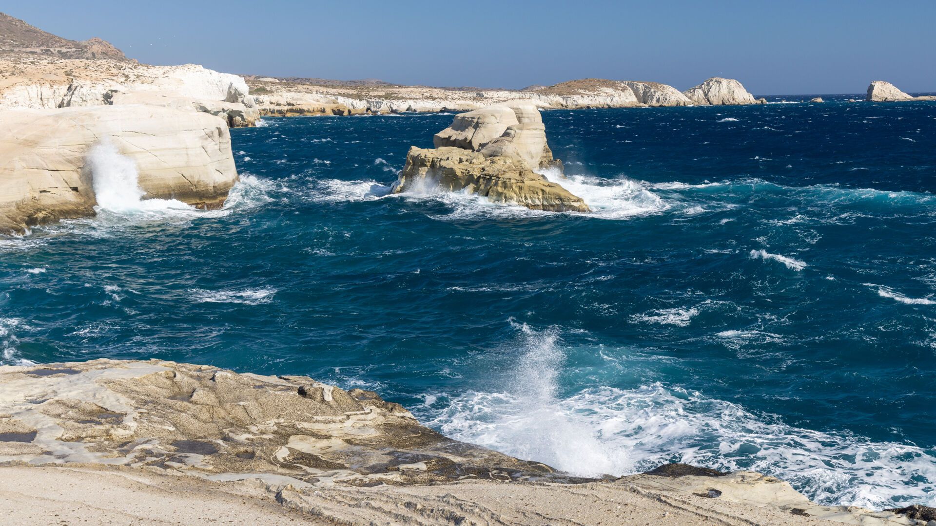 We really got a feel for the Greek Island of the Aegean with our stop this morning on the island of Milos. We toured the northern part of the island with our first stop being at Sarakiniko, where we walked down to see the amazing rock formations. We had fun trying to photograph the waves as they came crashing in on the cliffs.