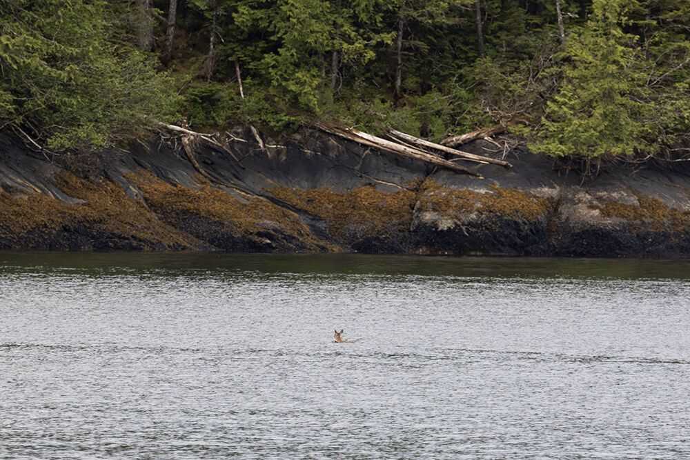 After ghosting past the New Eddystone Light in Behm Canal under clear blue skies, National Geographic Sea Lion veered ever so slightly to the east, where we entered the magical splendor of Misty Fjords National Monument. A large group of guests gathered on the bow to take in the majesty of these 3000-foot-tall cliffs of granite and basalt when one of our eagle-eyed guests spotted a Sitka black-tailed deer swimming against the shore. Confusion ensued as this is a rare sighting. At three-quarters of a mile off, some thought it was a moose, others thought it was a coyote, and a few held fast to the idea that it was a deer, which proved to be the case as we drew nearer.