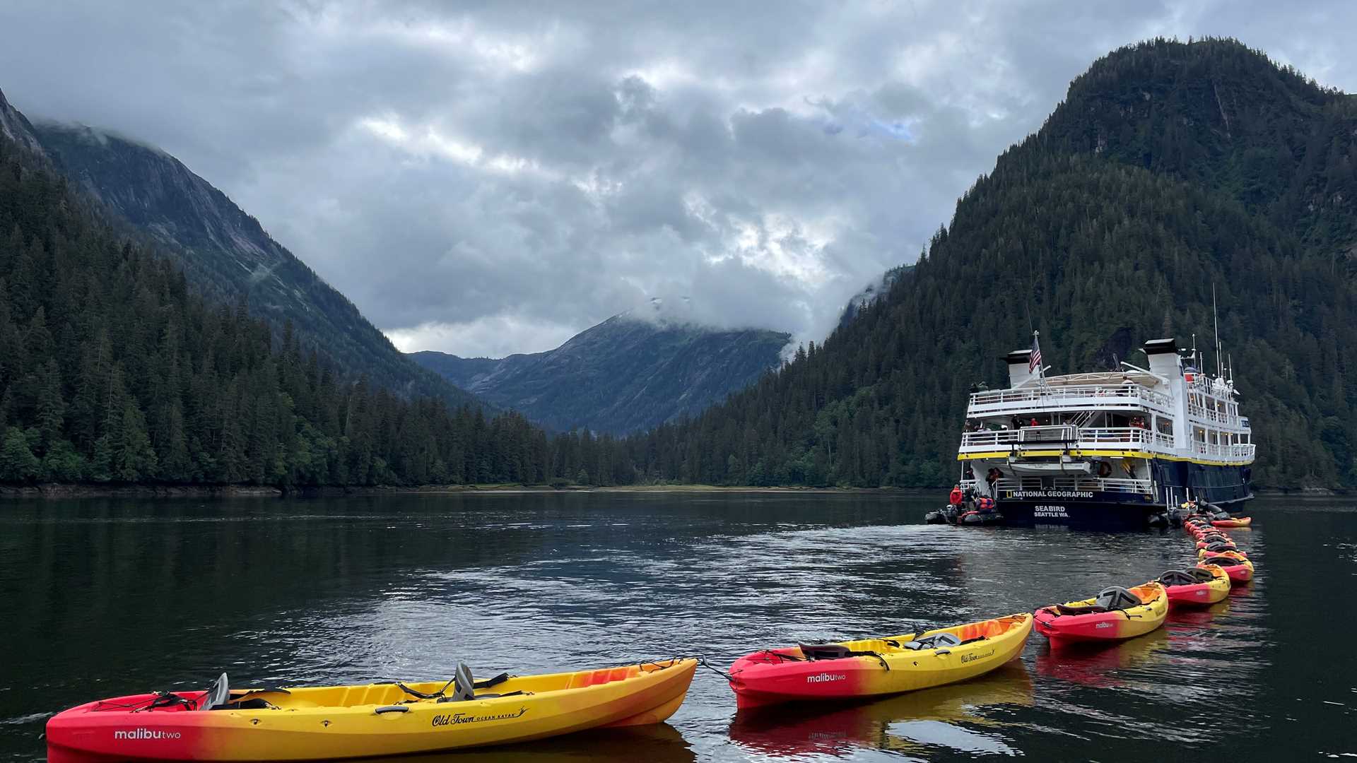With a heartfelt thanks to former President Jimmy Carter, today we explored the Misty Fjords National Monument, which he signed into existence in 1978. It is easy to see why this is sometimes called the Yosemite of the North, with sheer walls reaching over a thousand feet skyward. Down at the water level, our kayakers paddled while curious harbor seals contemplated these odd semi-aquatic creatures, us! There was obviously a salmon stream at the end of the fjord as numerous mature and immature eagles sat perched on logs, boulders, and sandbars, occasionally squabbling over a carcass. This was a diverse and stunning introduction to the Southeast Alaska landscape.